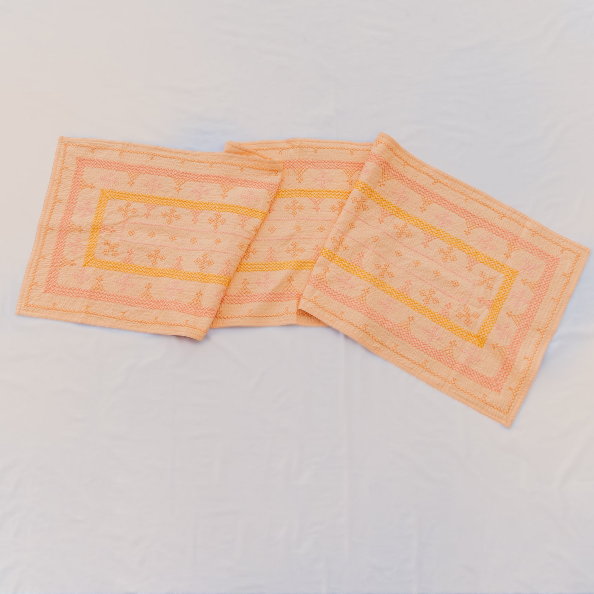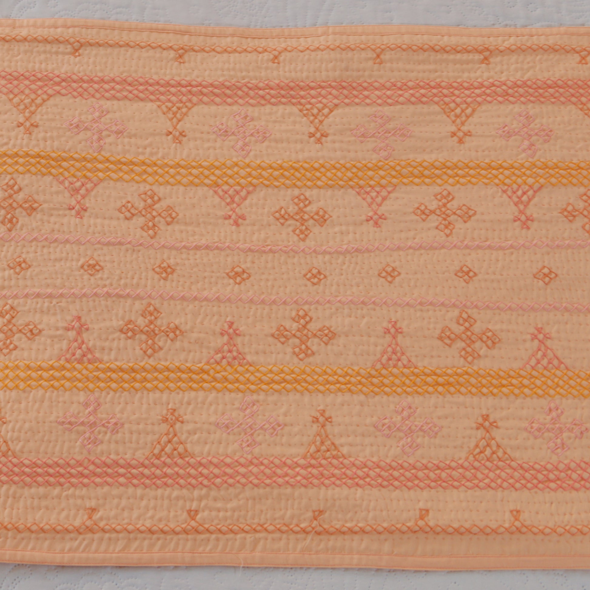 A beautifully hand-embroidered bed runner in soft peach tones. The delicate embroidery and calming palette bring warmth and grace to any space. Versatile in design, it can be styled as a bed runner or table runner, adding effortless sophistication to your home décor.