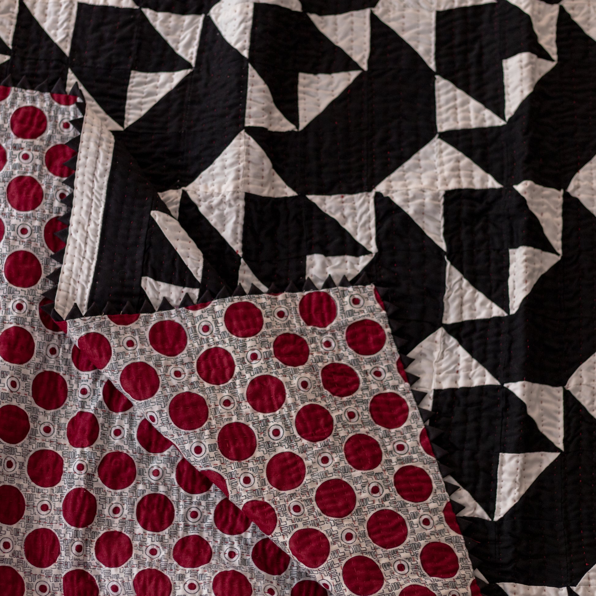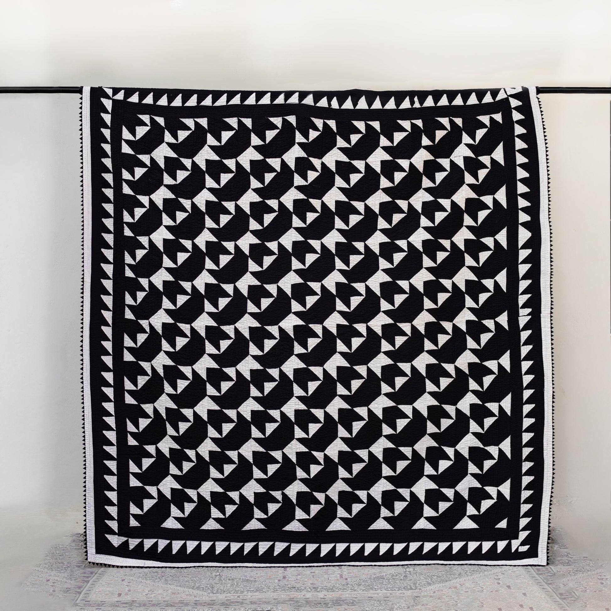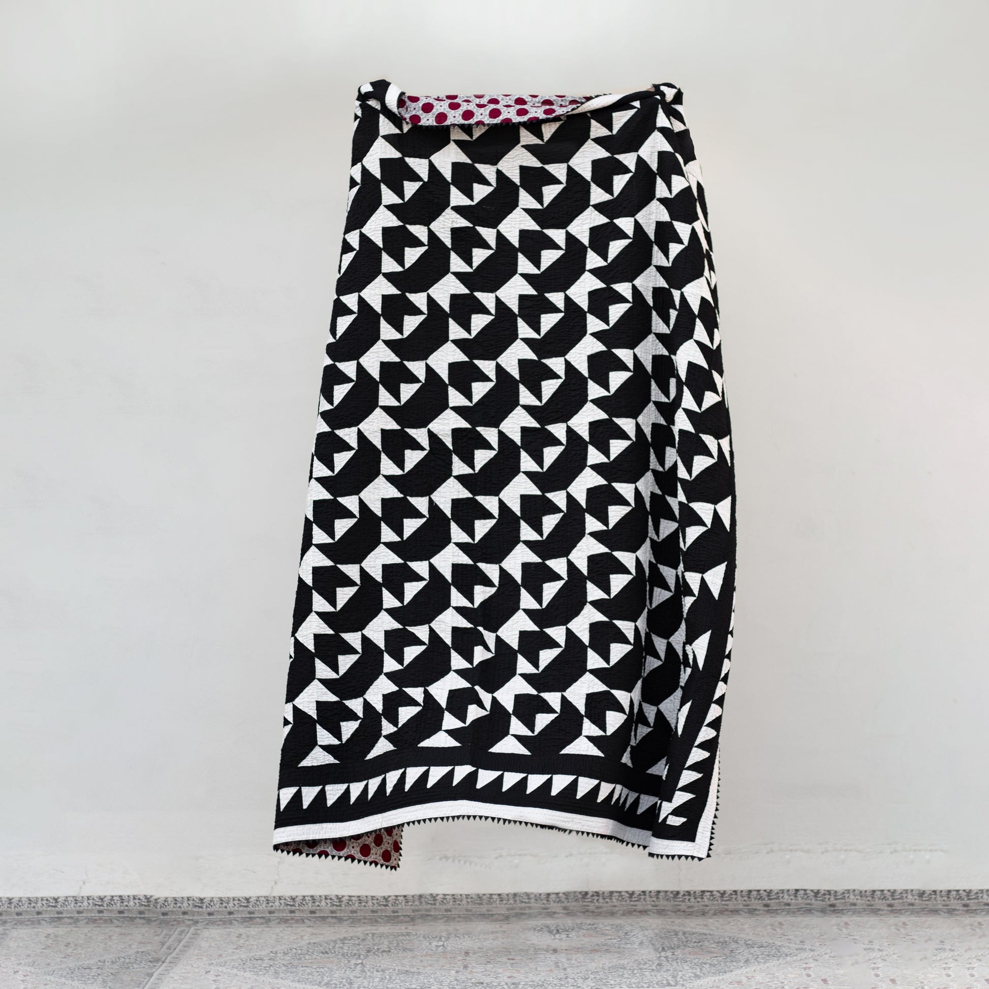 This striking Black & White Patchwork Rilli showcases traditional hand-stitched geometric patterns, creating a bold and timeless aesthetic. On the reverse side, a vibrant maroon circle print design adds a modern and playful contrast, making it a versatile quilt you can flip for two unique looks. Perfect as a statement piece for your bed or sofa. Handmade by rural female artisans of Sindh