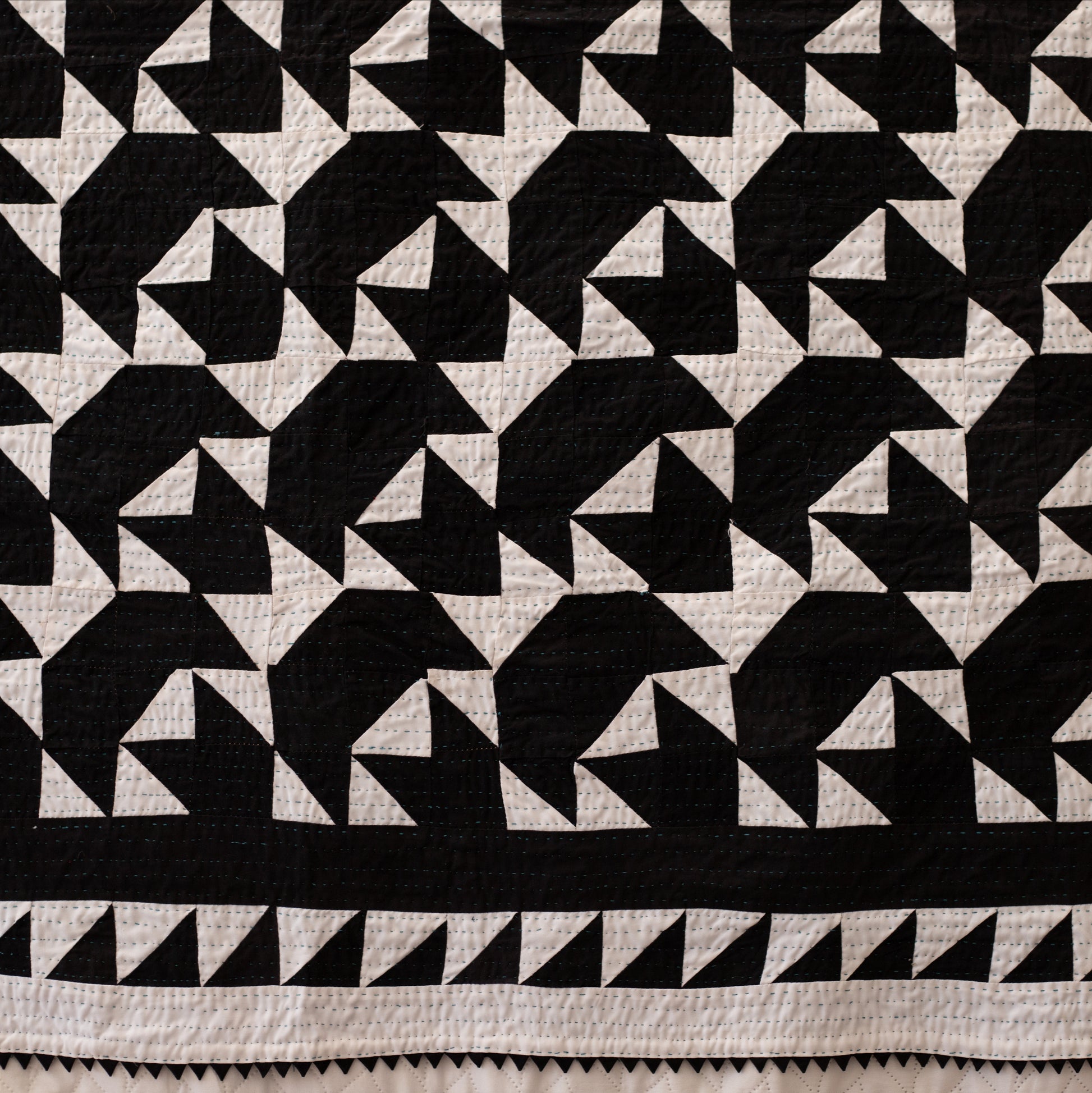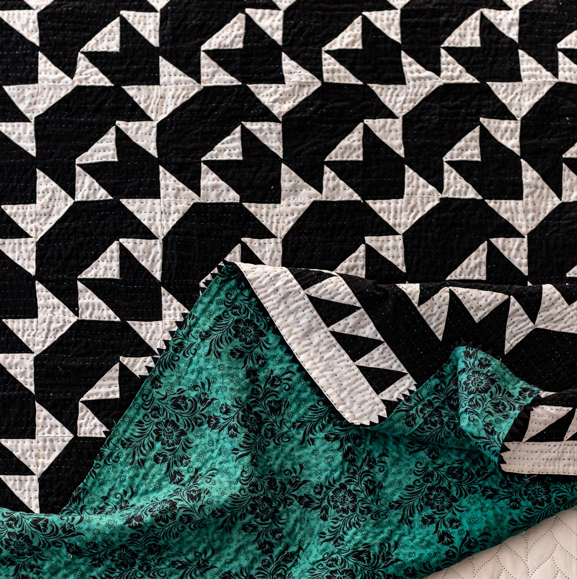 A striking monochrome patchwork quilt featuring geometric sailboat-like motifs in bold black and white. The reverse side adds a delightful surprise with a teal floral print. Carefully hand-stitched using traditional techniques, this Rilli brings both modern style and cultural heritage into your home.