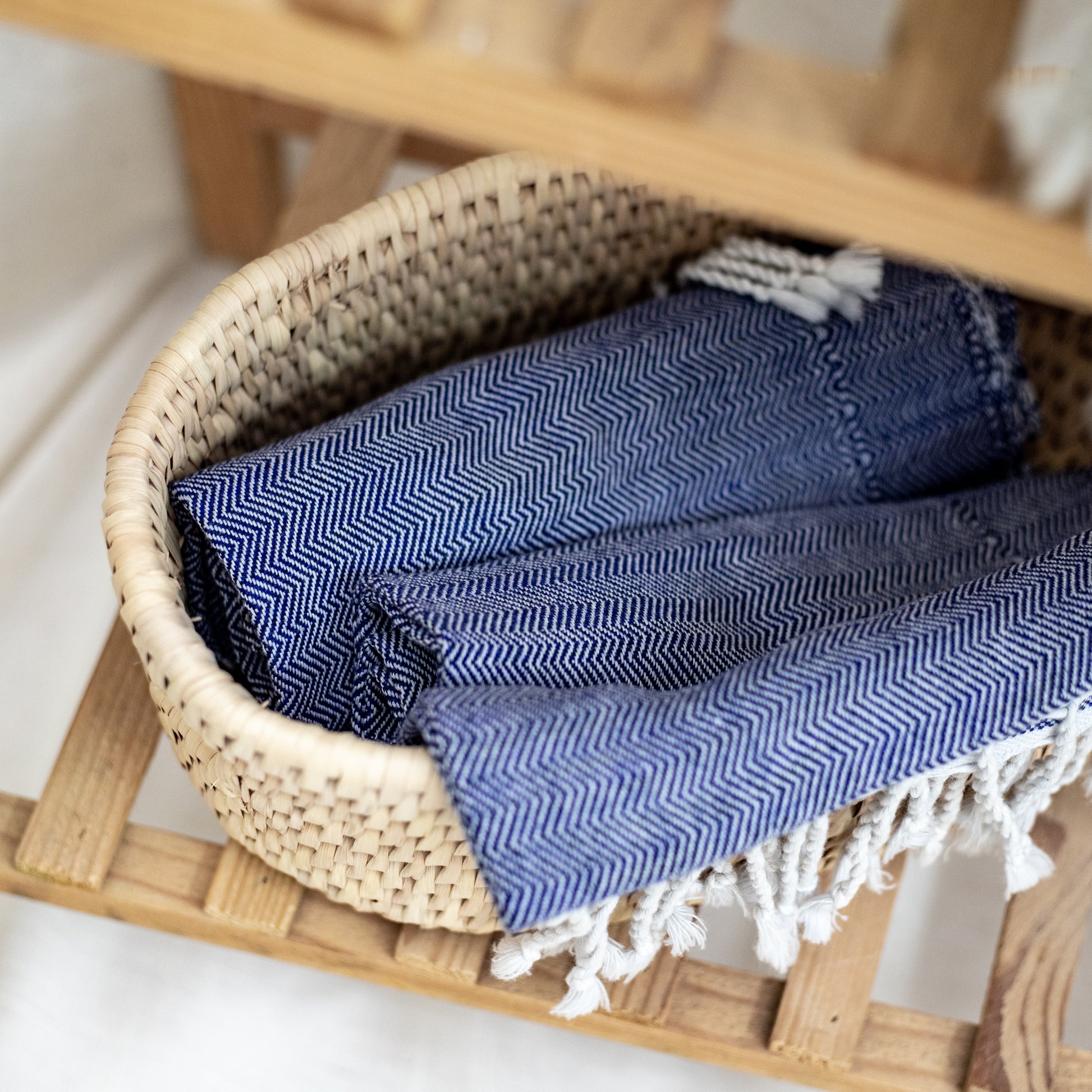 Handwoven on traditional pitlooms by skilled rural artisans, this soft blue bath towel features a classic herringbone weave. Crafted in natural cotton, it offers gentle absorbency and a lightweight feel. Perfect for elevating daily rituals with artisanal charm.
