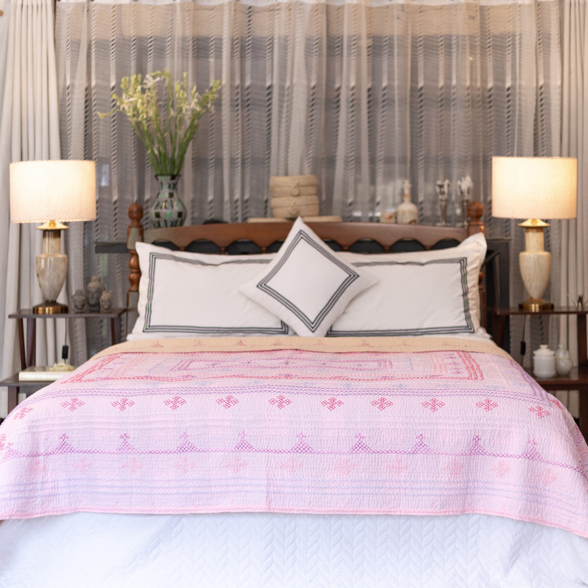 A delicate blush pink front, adorned with hand-stitched motifs in shades of lilac and soft red, creates a gentle, romantic mood. The reverse side in warm peach brings a subtle glow, making this Rilli perfect for calm, light-filled spaces.