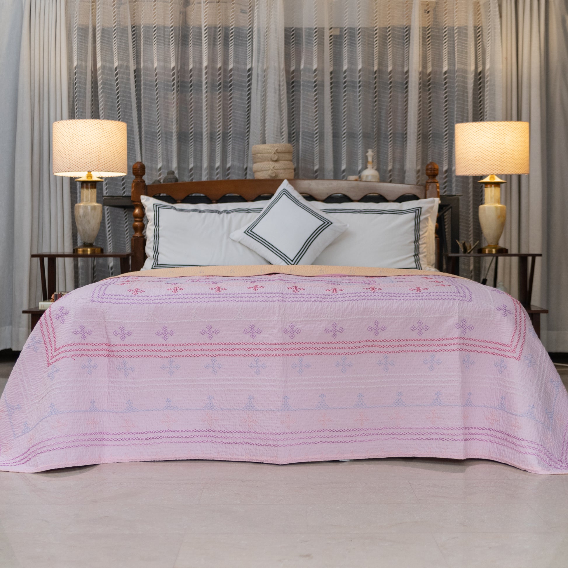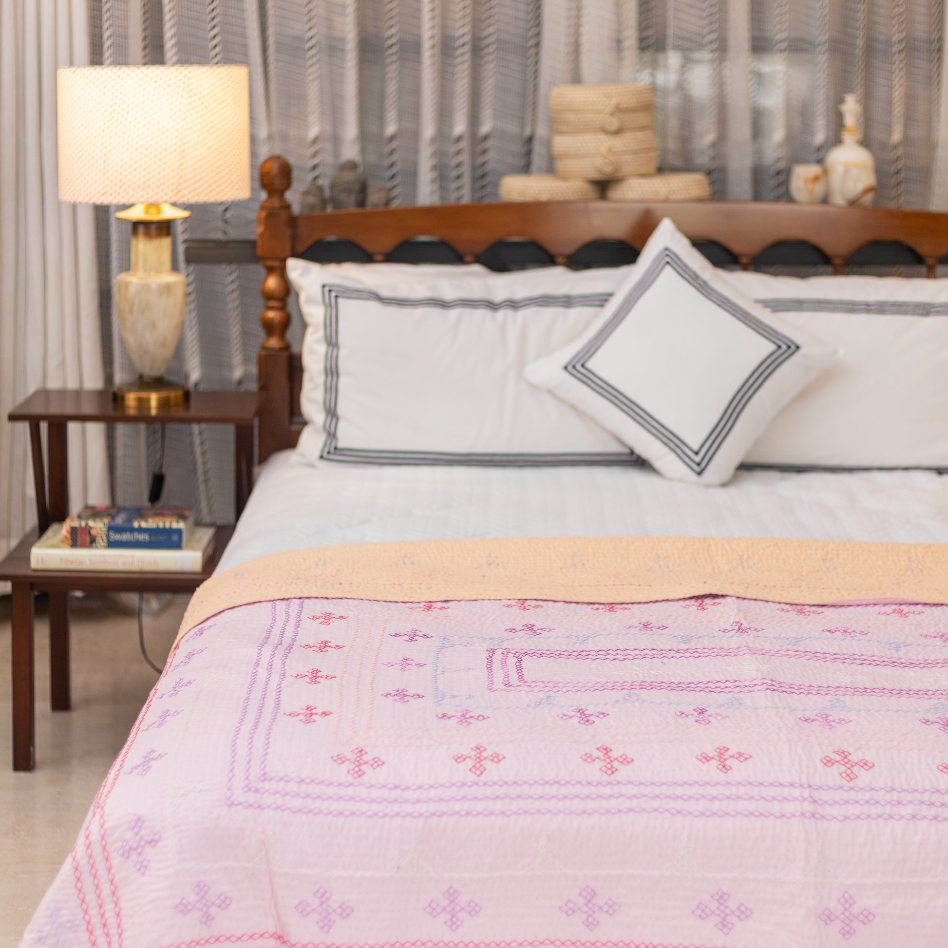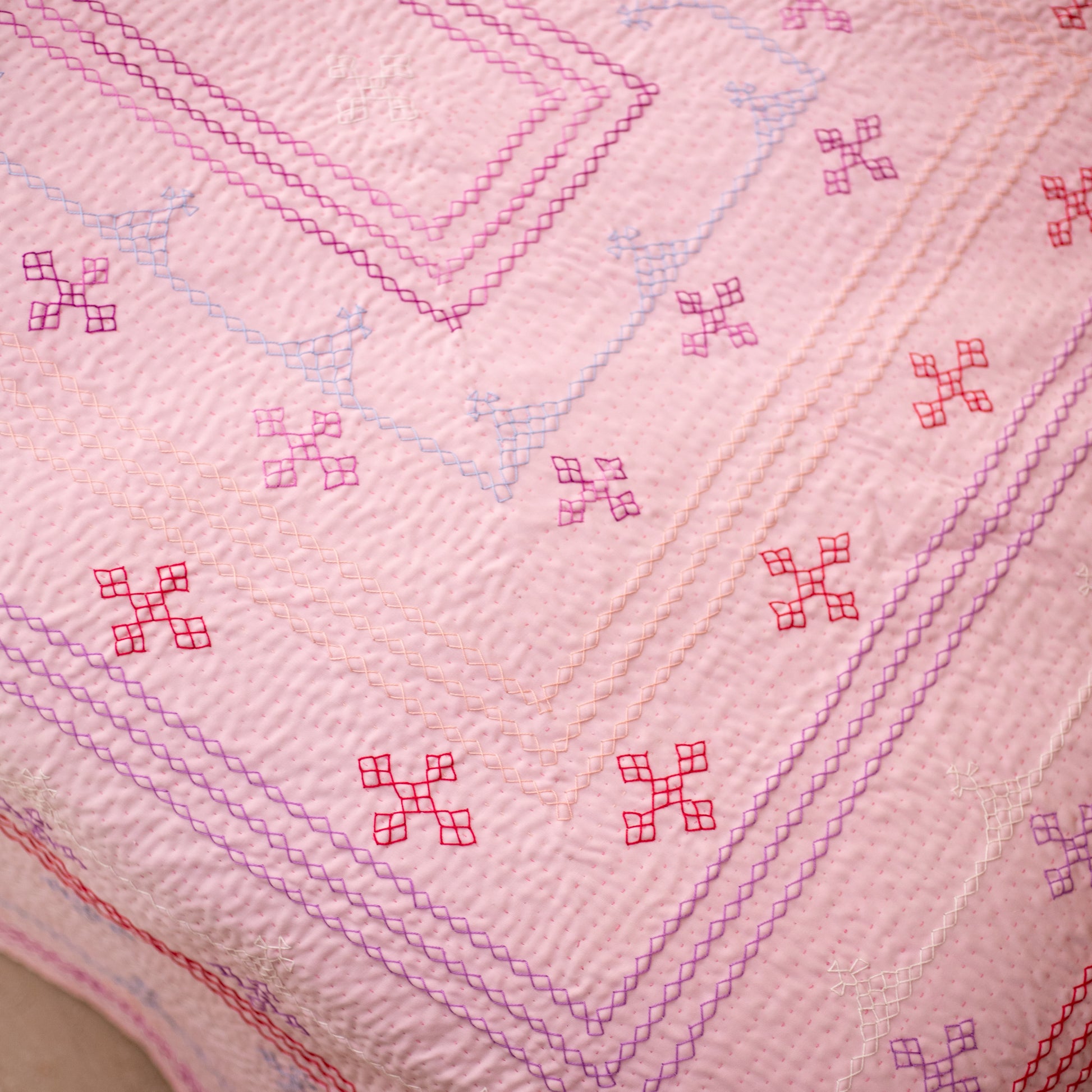 delicate blush pink front, adorned with hand-stitched motifs in shades of lilac and soft red, creates a gentle, The reverse side in warm peach brings a subtle glow, making this Rilli perfect for calm, light-filled spaces.