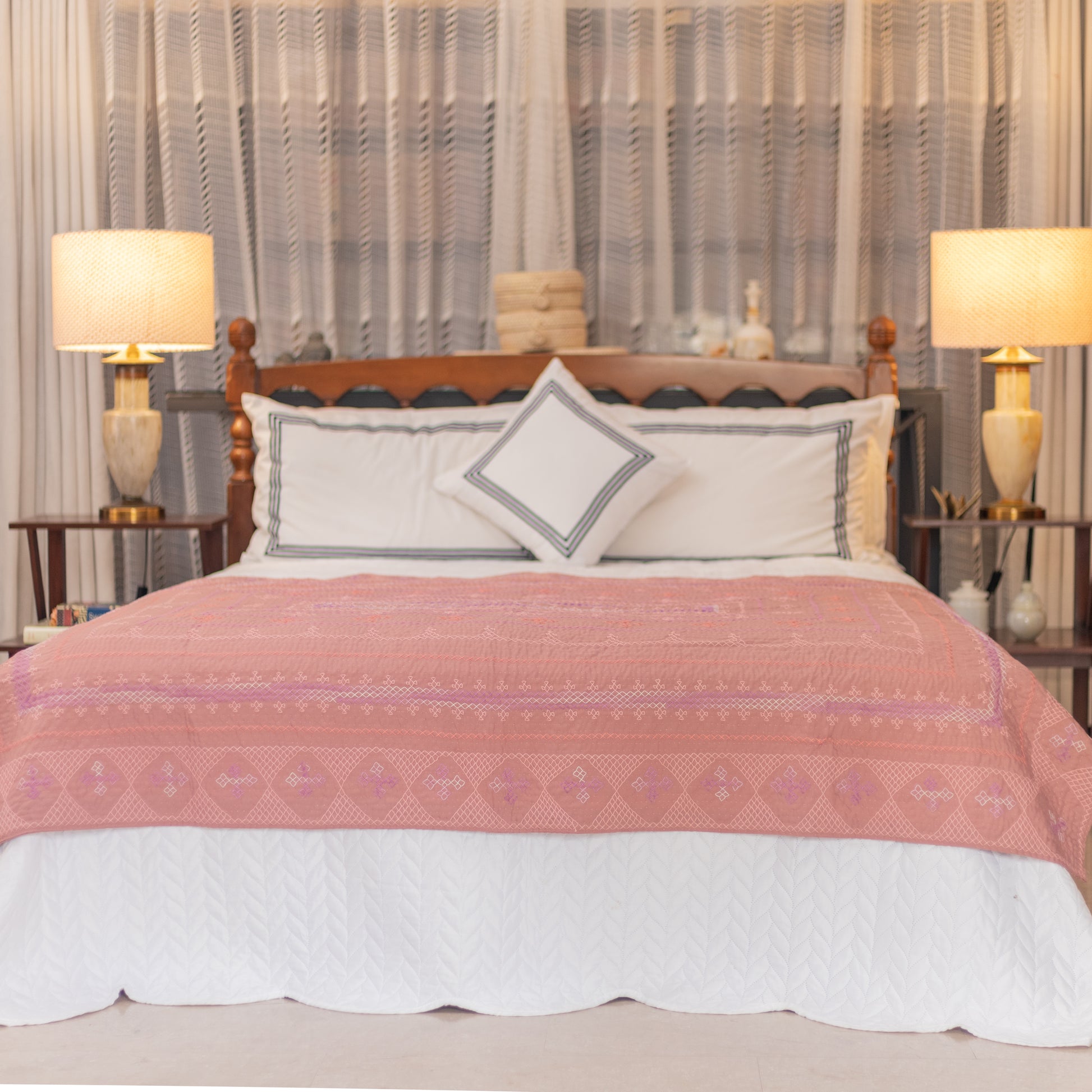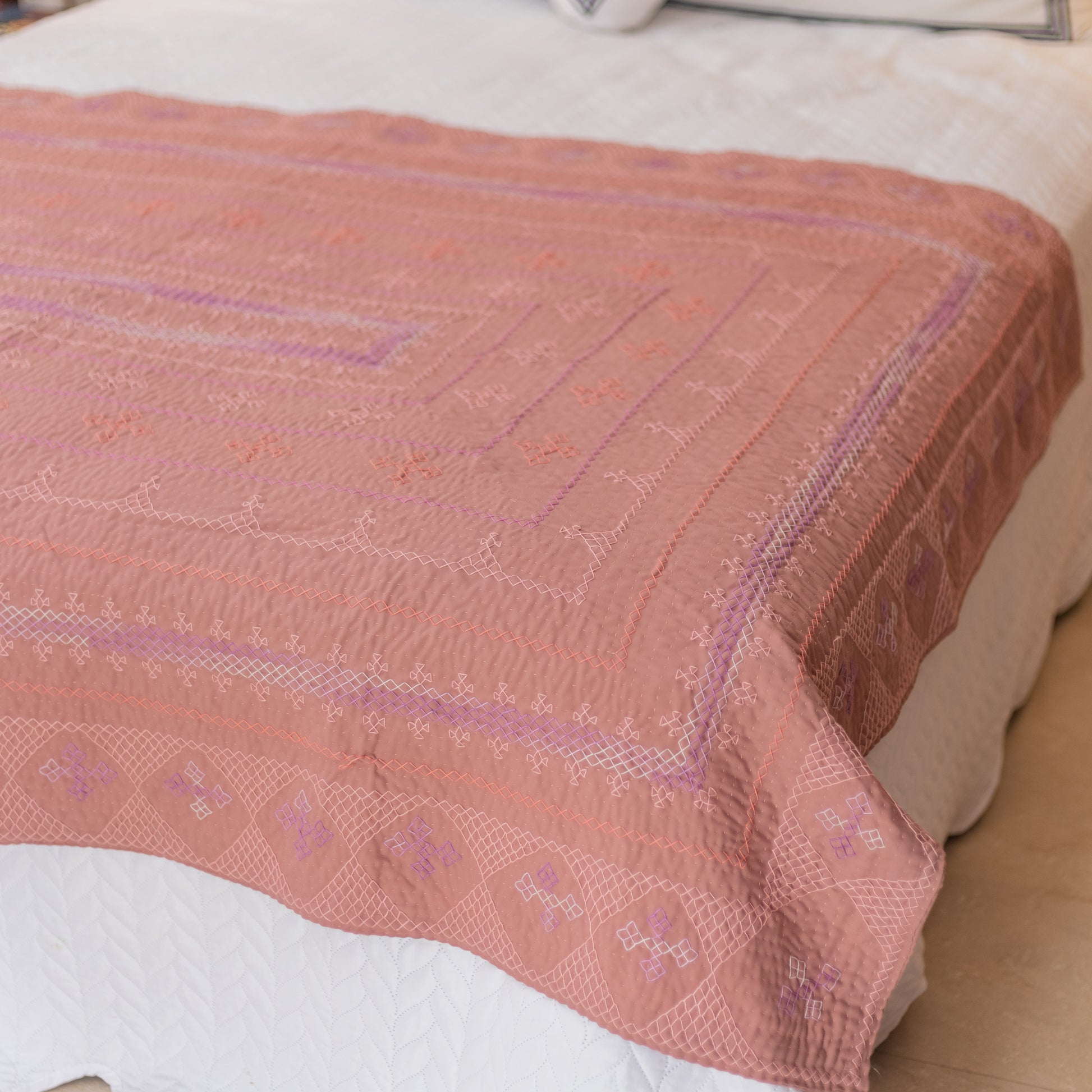 In a soothing dusty rose shade with hints of sage, this rilli throw brings a soft, earthy elegance to your home. Sized as a twin, it features delicate back-printed detailing for added charm. Handmade with care by rural female artisans.