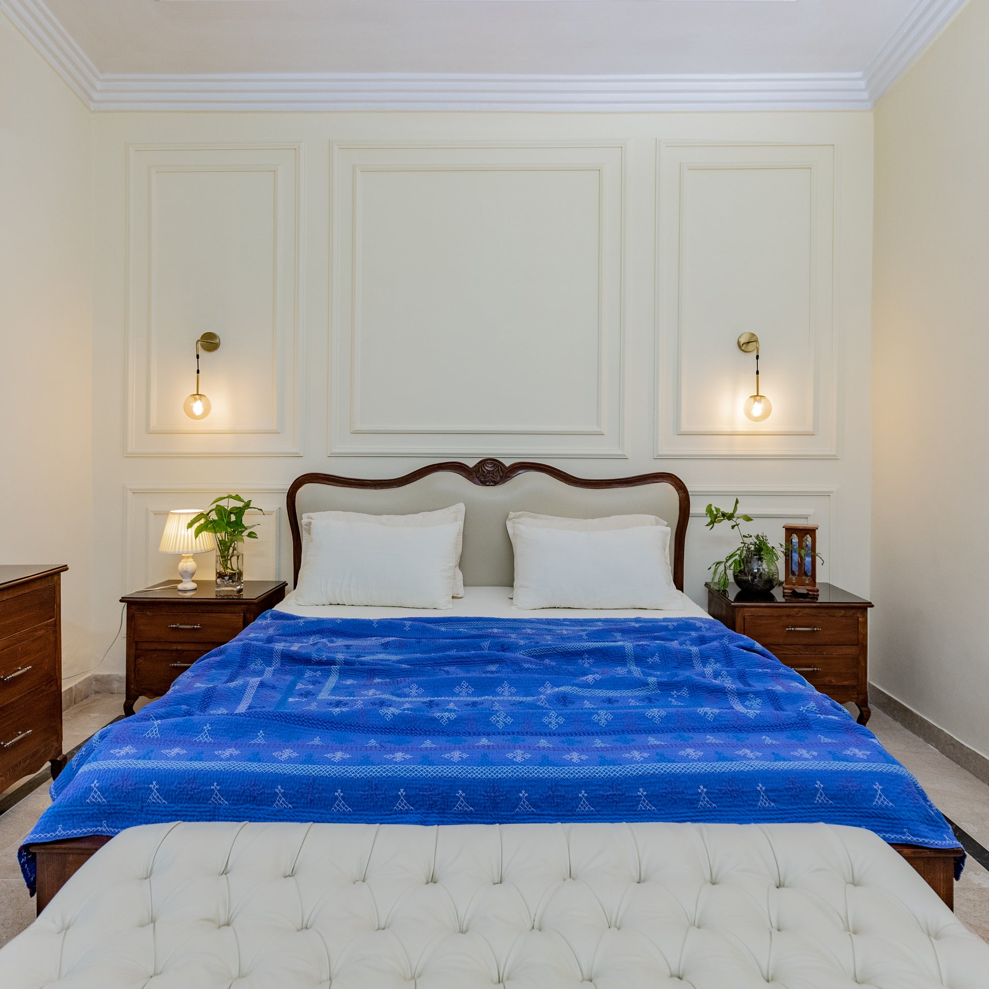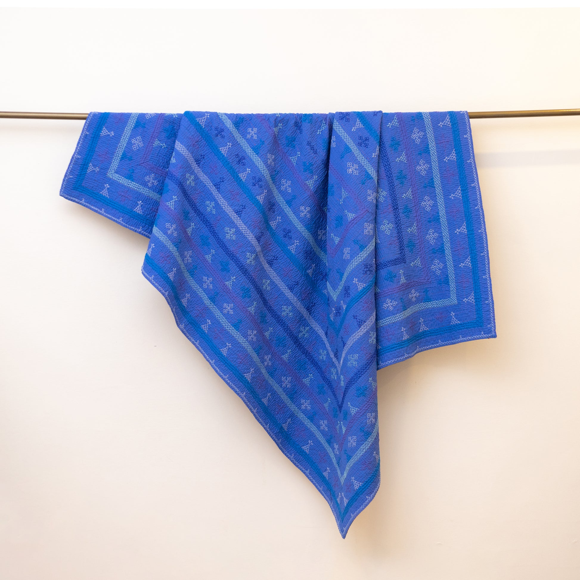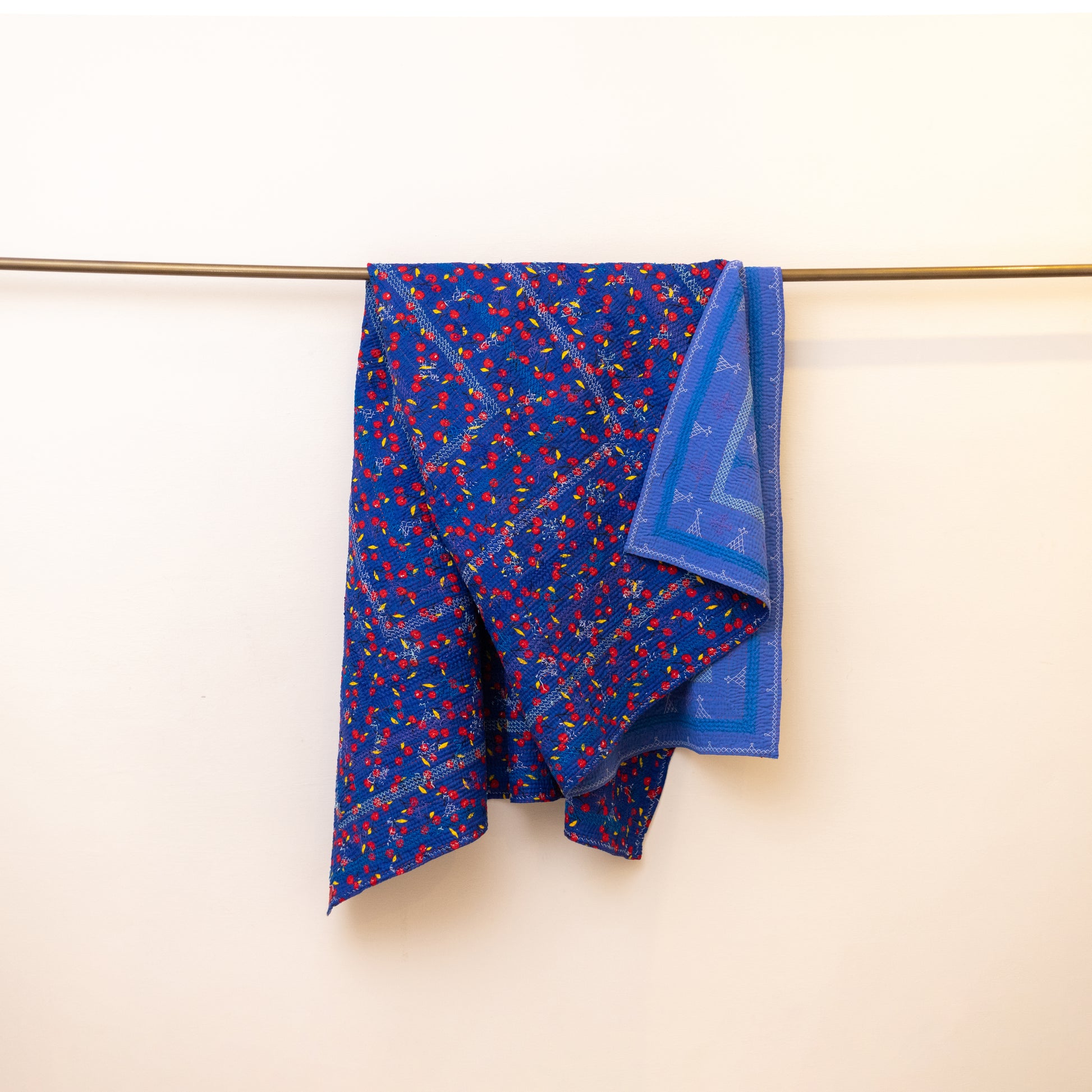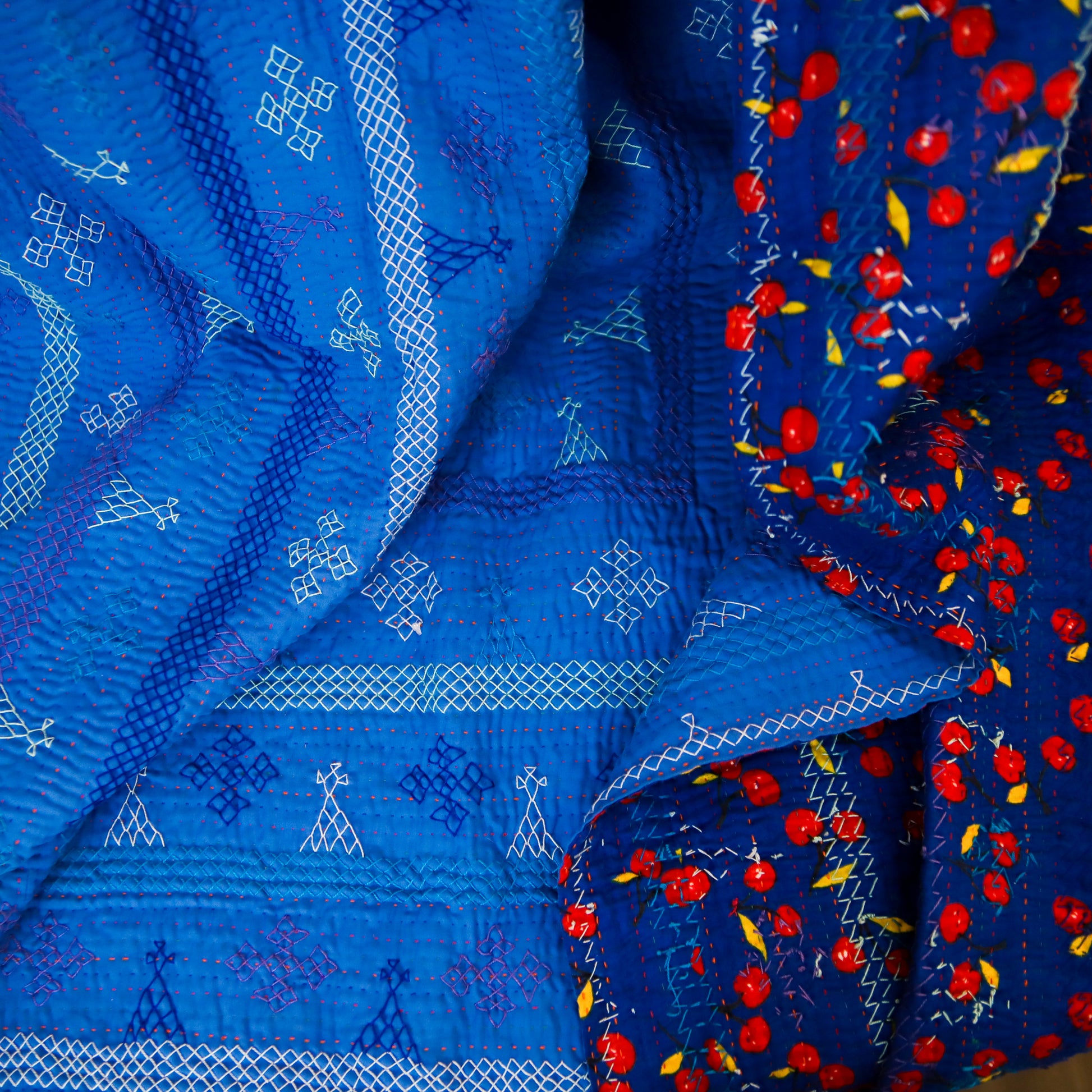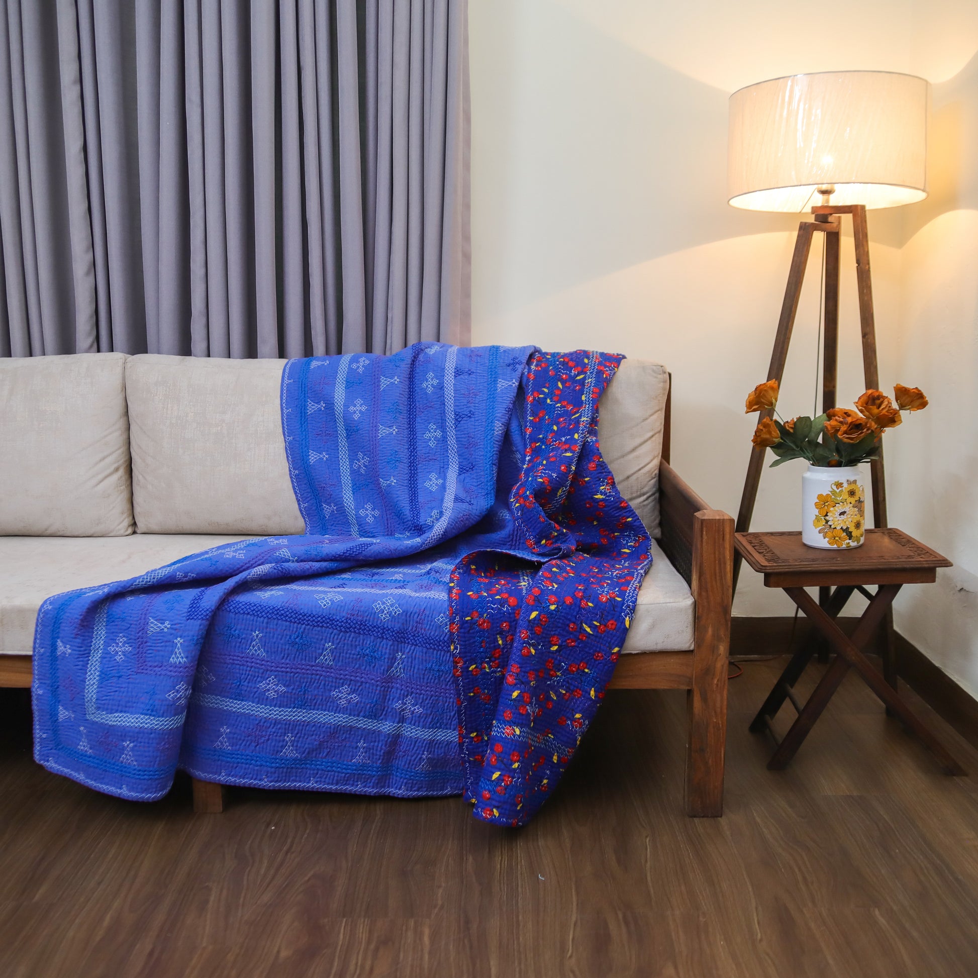 Twin-size Rilli in a deep blue hue with intricate back-printed detailing. Adorned with traditional stitched motifs and vibrant floral patterns on the reverse. Handmade with care by rural female artisans.