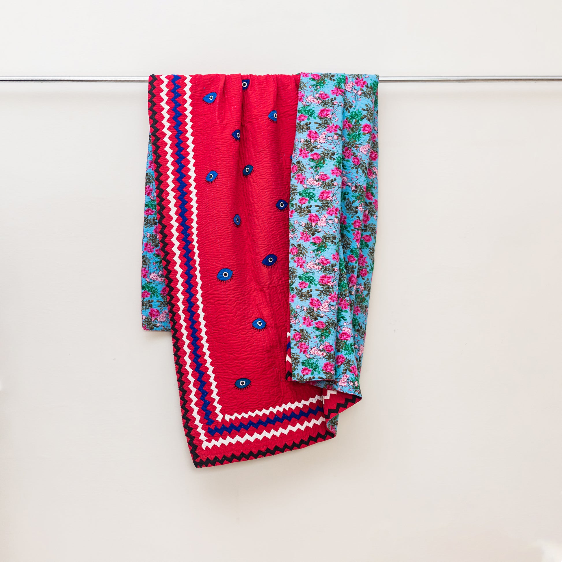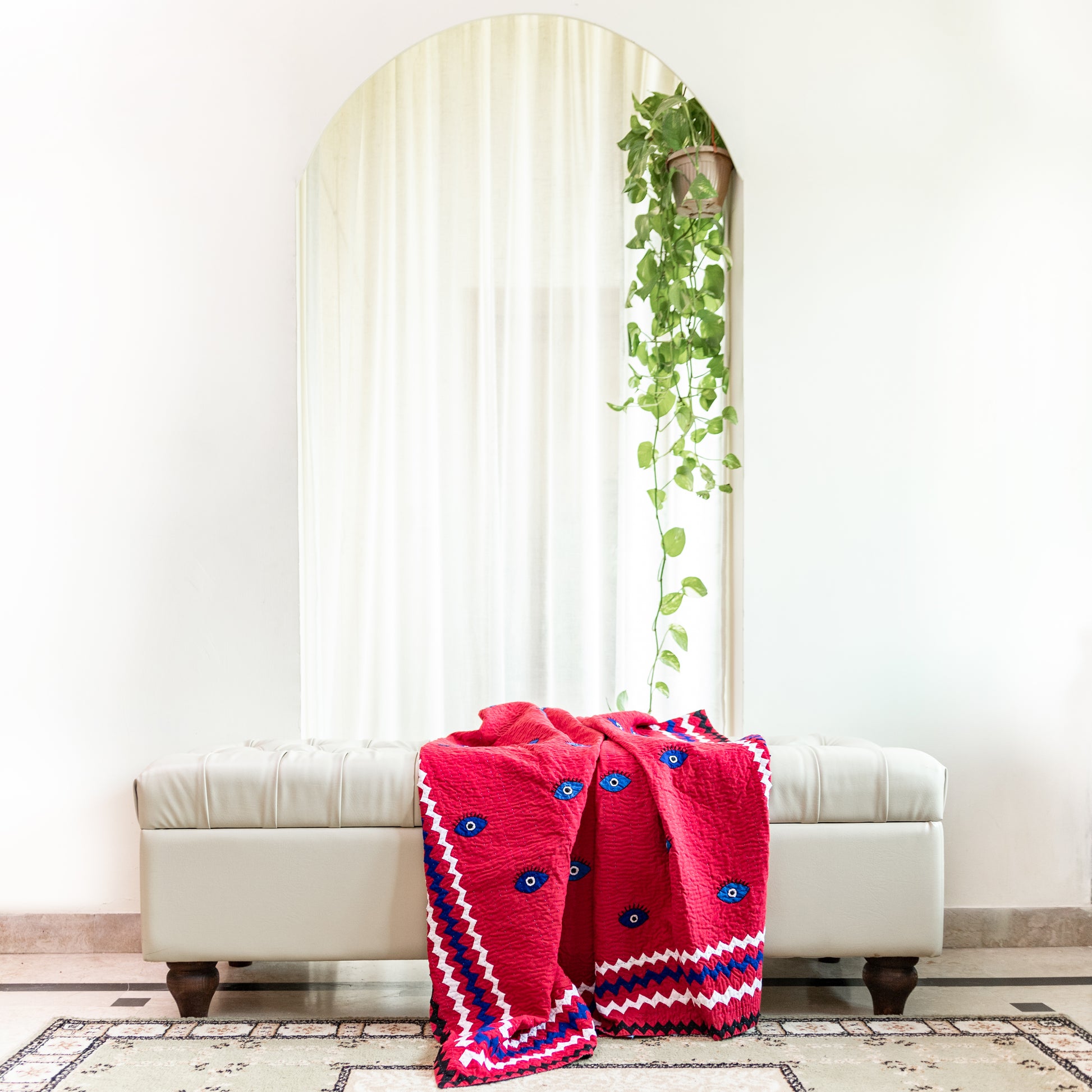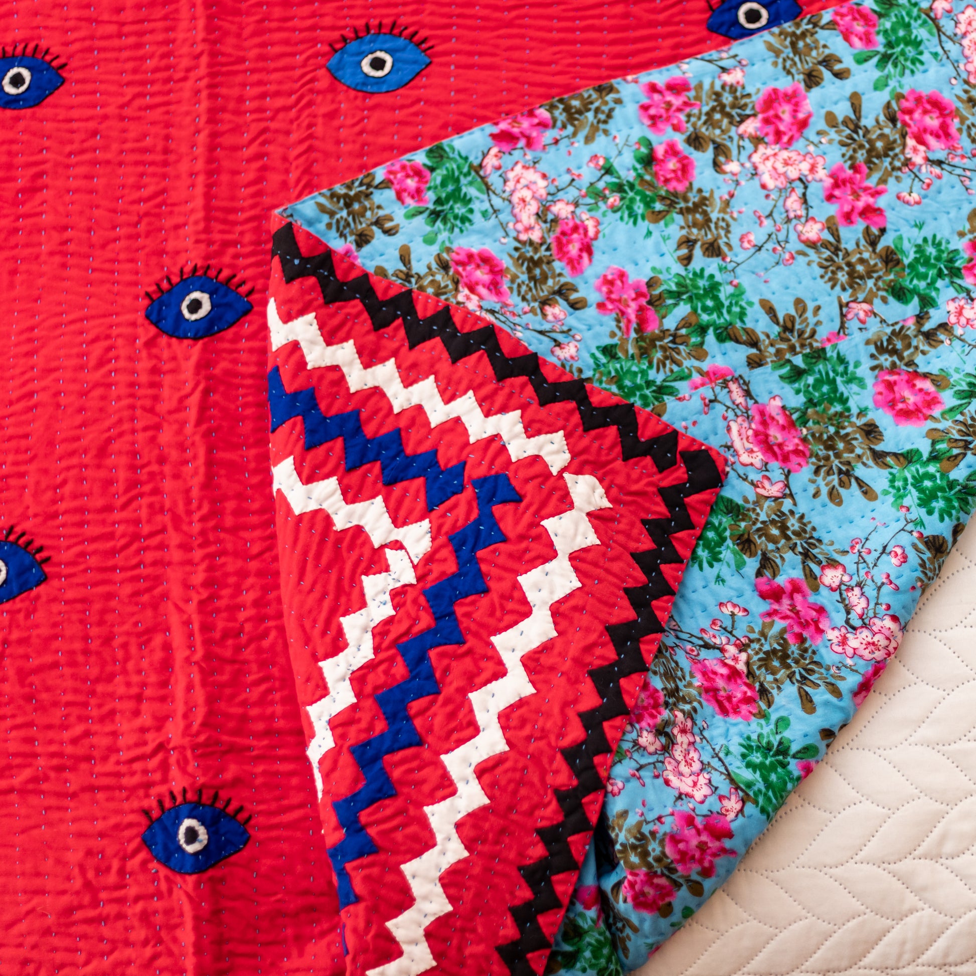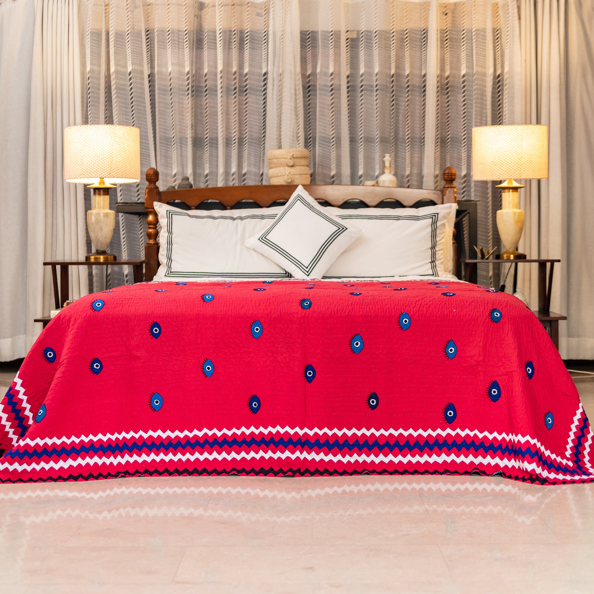A striking red rilli adorned with bold evil eye motifs in blue, bordered with a vibrant chevron design in red, white, and navy. The reverse side features a delicate printed pattern, making it versatile for everyday use.