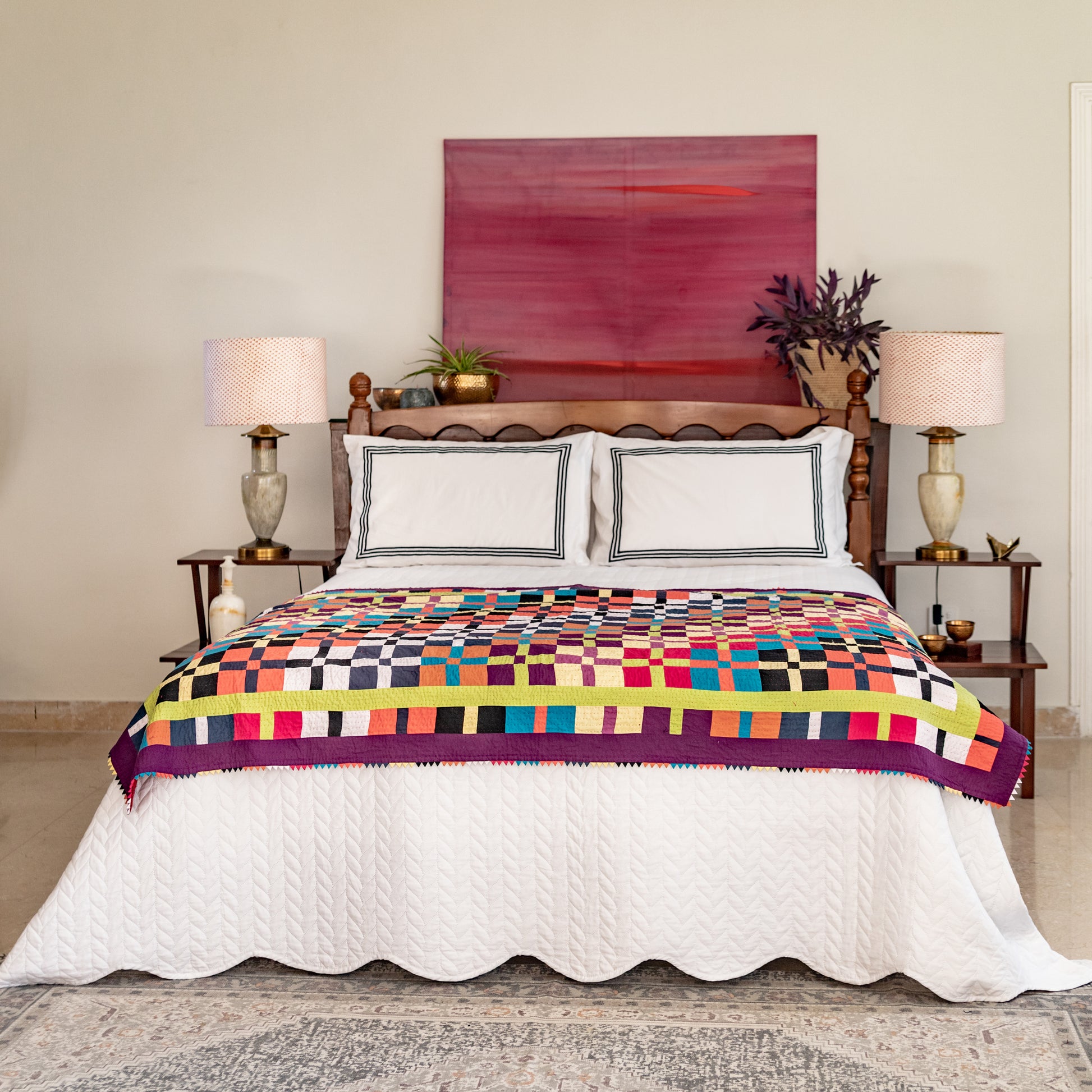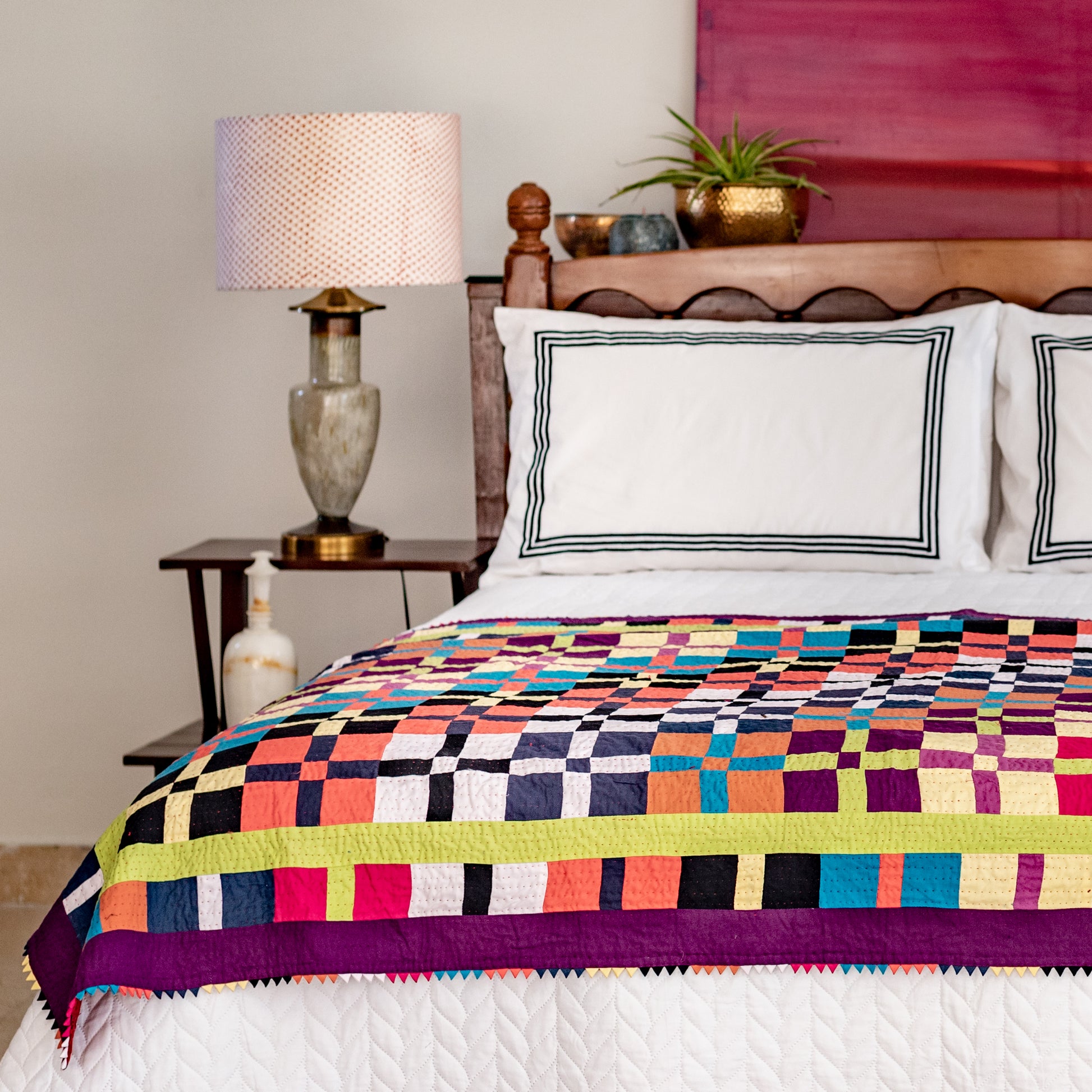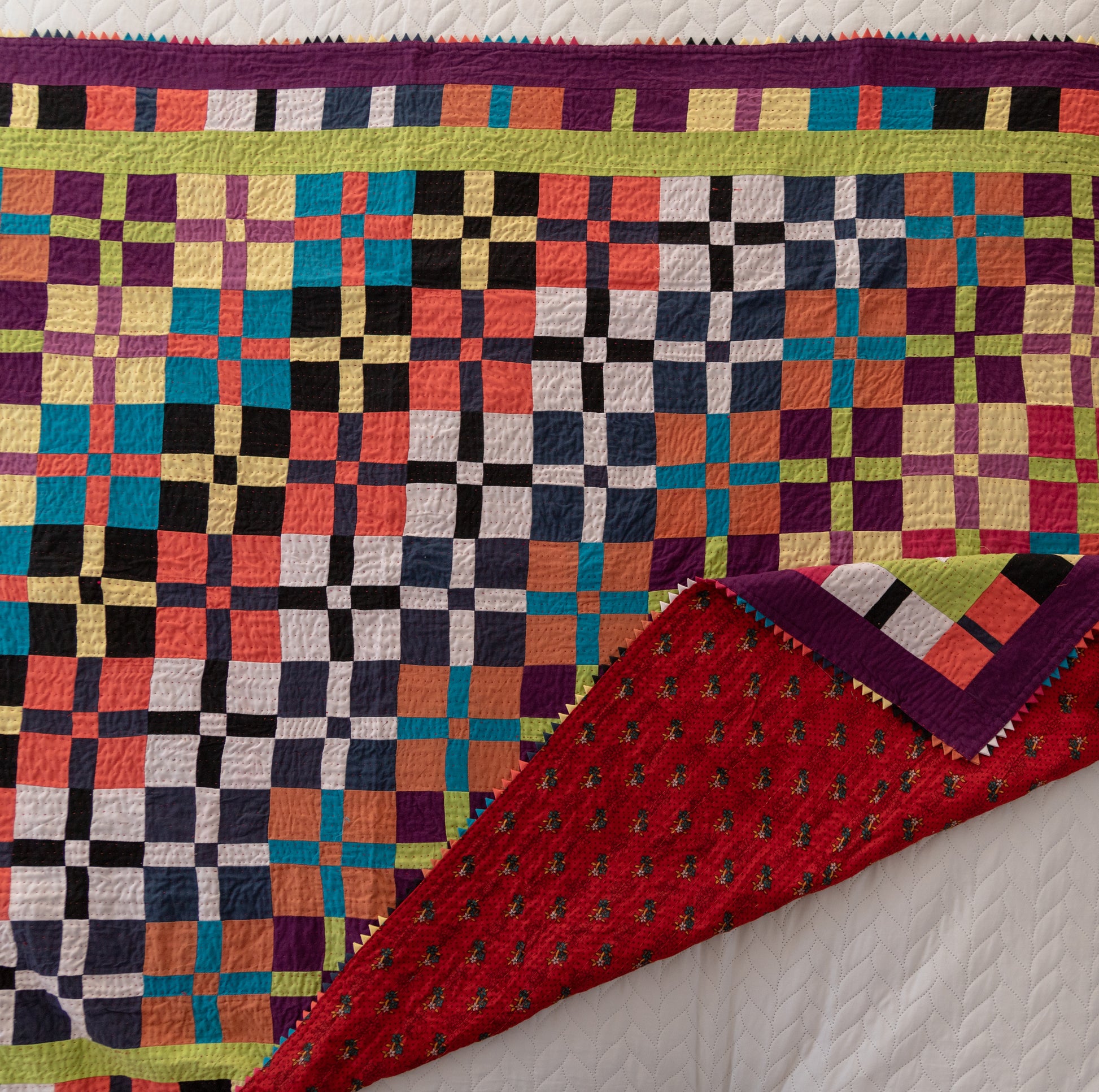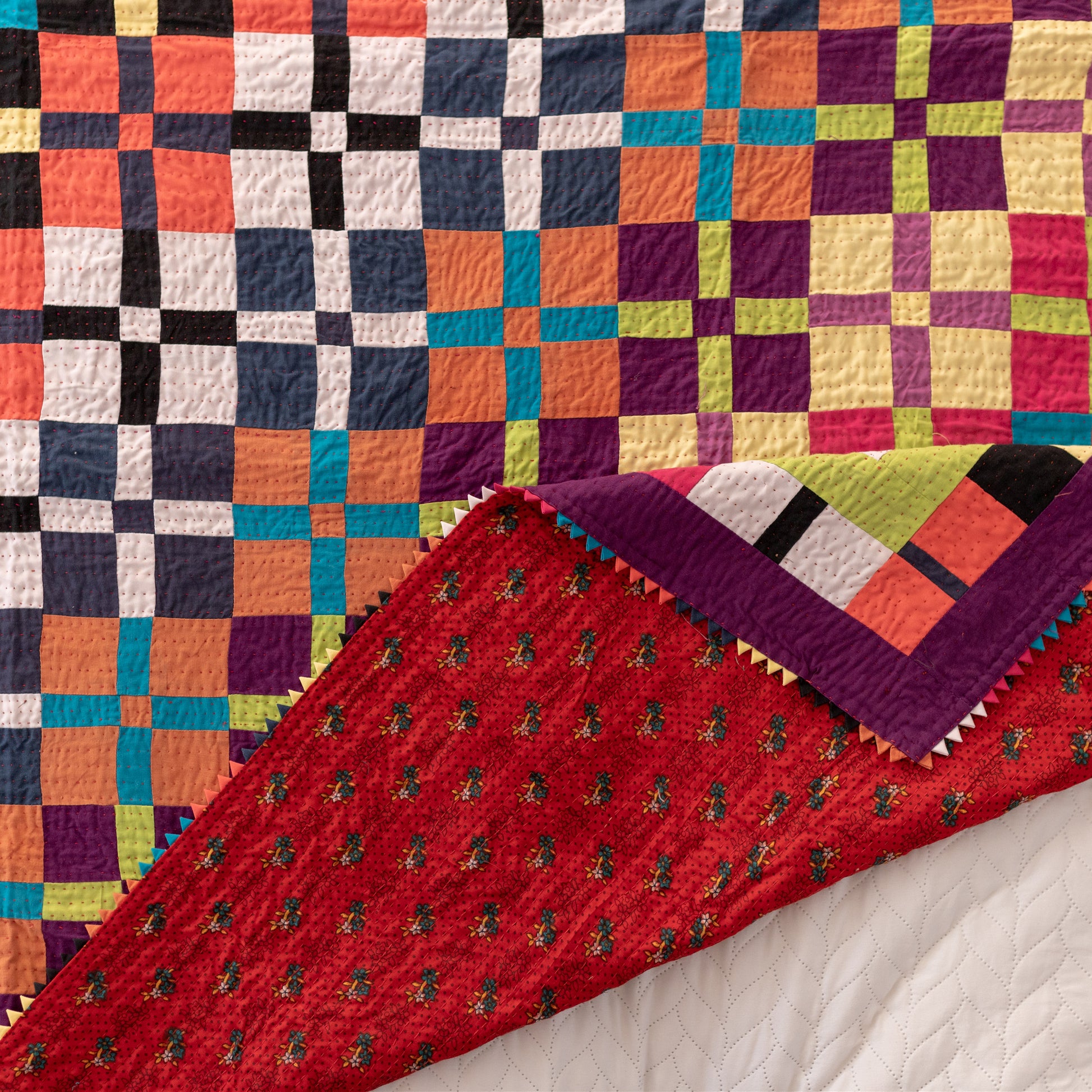 A playful ode to pattern and color, the Grid Rilli features a vivid patchwork of intersecting lines in jewel tones and warm earthy hues.