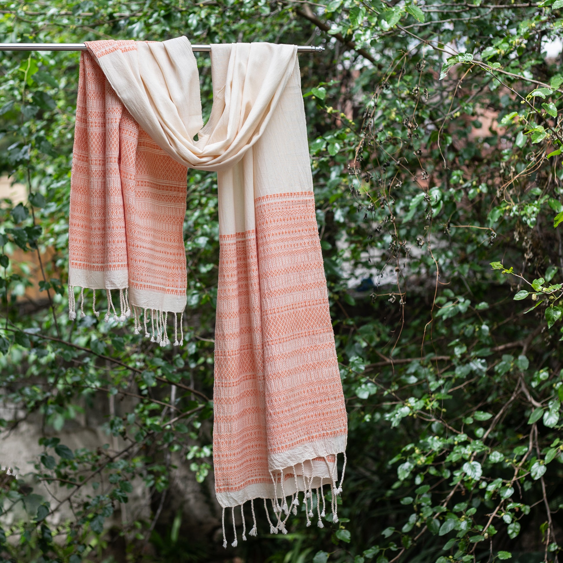 Handwoven Pit Loom Scarf – Cream & Peach: Woven in soft color and mellow coral threads, this hand loomed piece echoes warm desert winds and quiet sunrises — a whisper of summer for every season Handmade by skilled artisans.