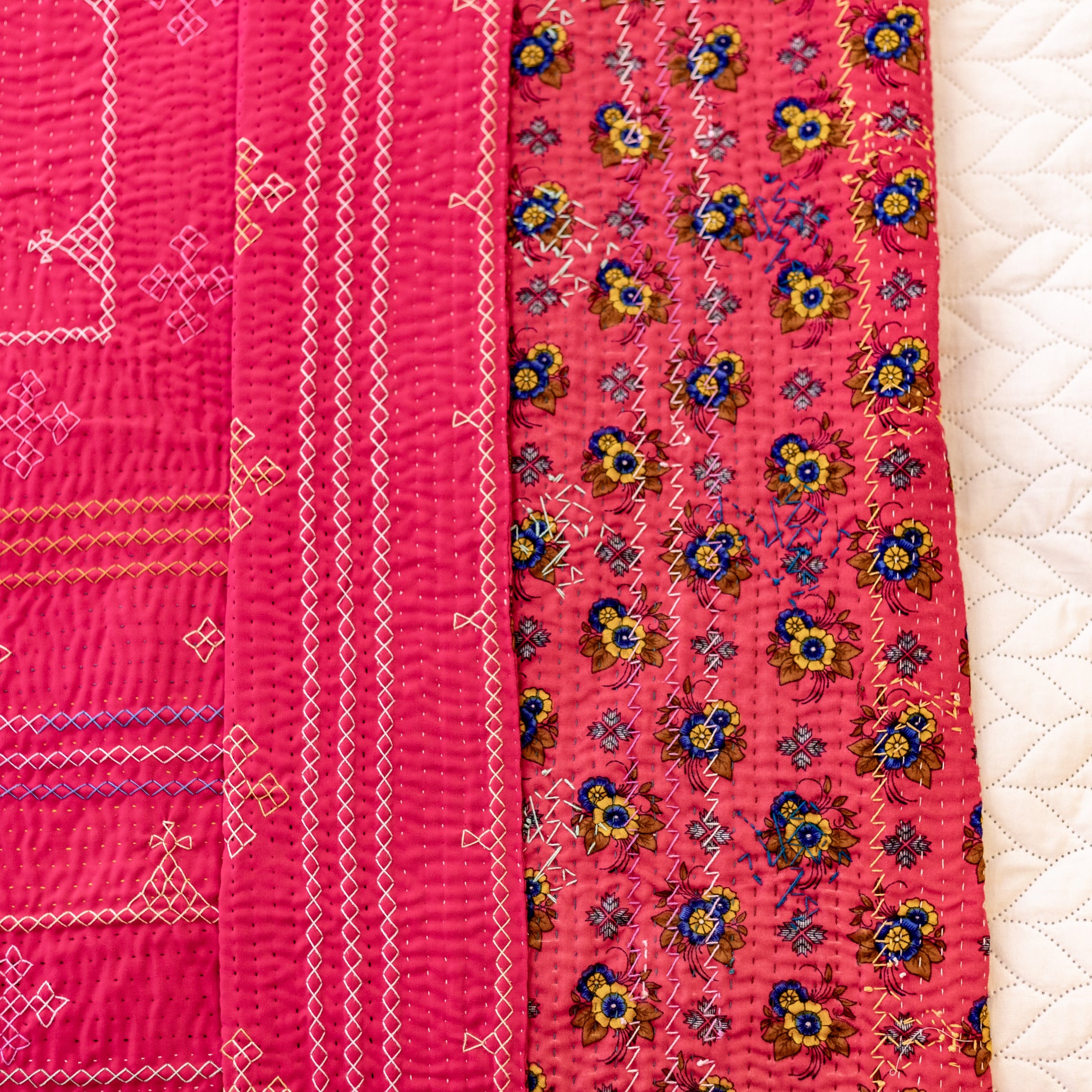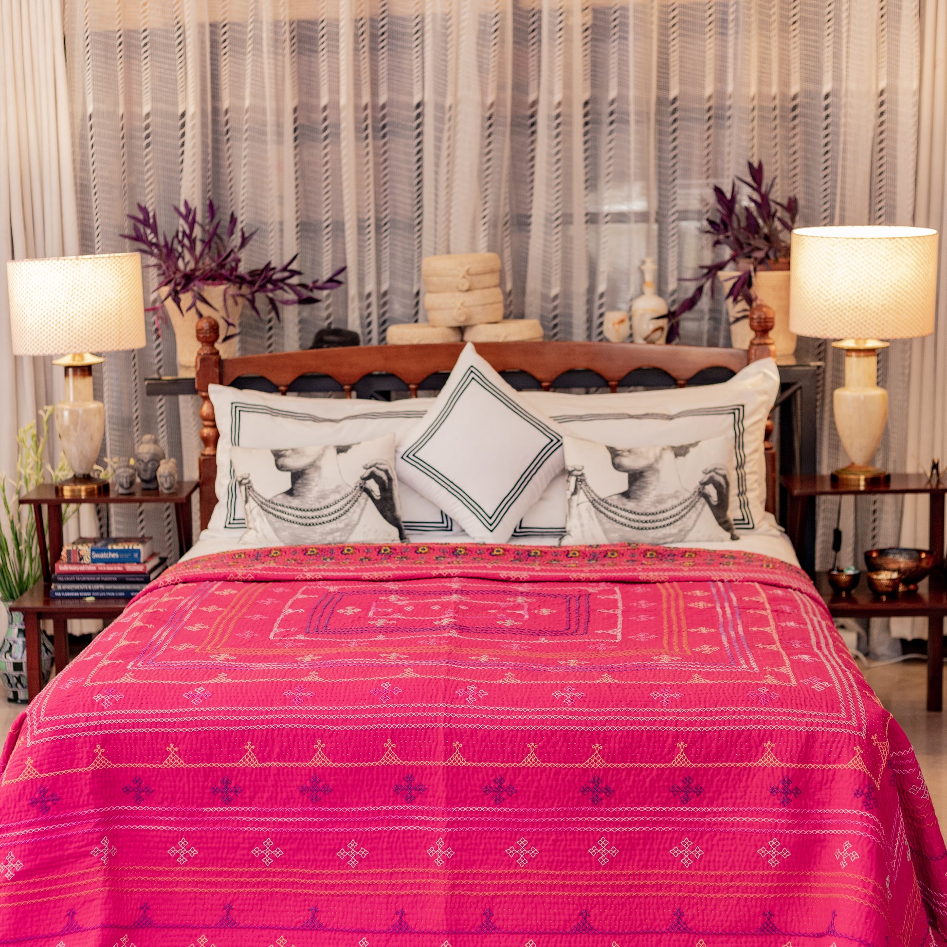 Vibrant and full of life, this hand-stitched Hot Pink J Rilli brings a joyful burst of color with its vivid pink hue and intricate back printed floral design. Traditional motifs in fine thread work add texture and charm, making it a radiant statement piece for any room. Perfect for layering or as a bold standalone spread.