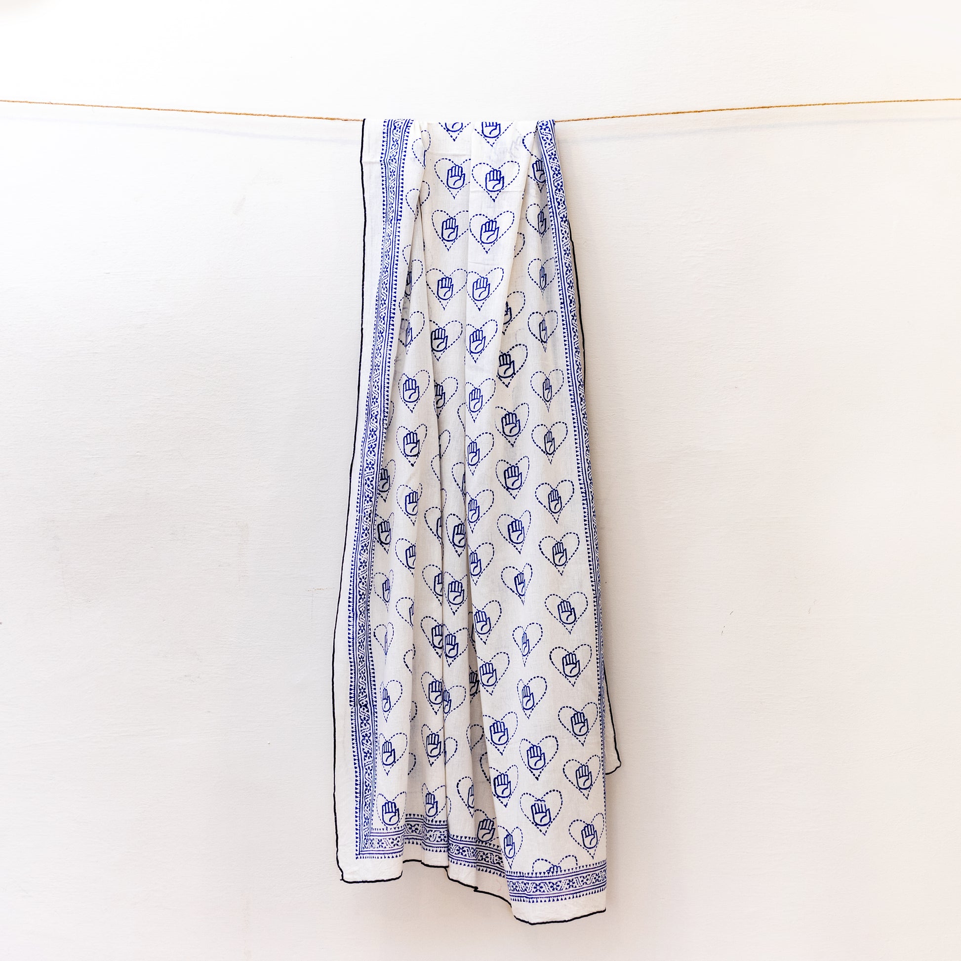 Celebrate craft and creativity with this White Ajrak Block Print Scarves, adorned with the exclusive “Love Handmade” print in blue. Combining the timeless technique of hand-block printing with a modern motif, it carries both cultural heritage and contemporary expression. Soft, breathable, and easy to style, this scarve makes a meaningful statement while honoring artisan skill. Handmade by skilled rural artisans.