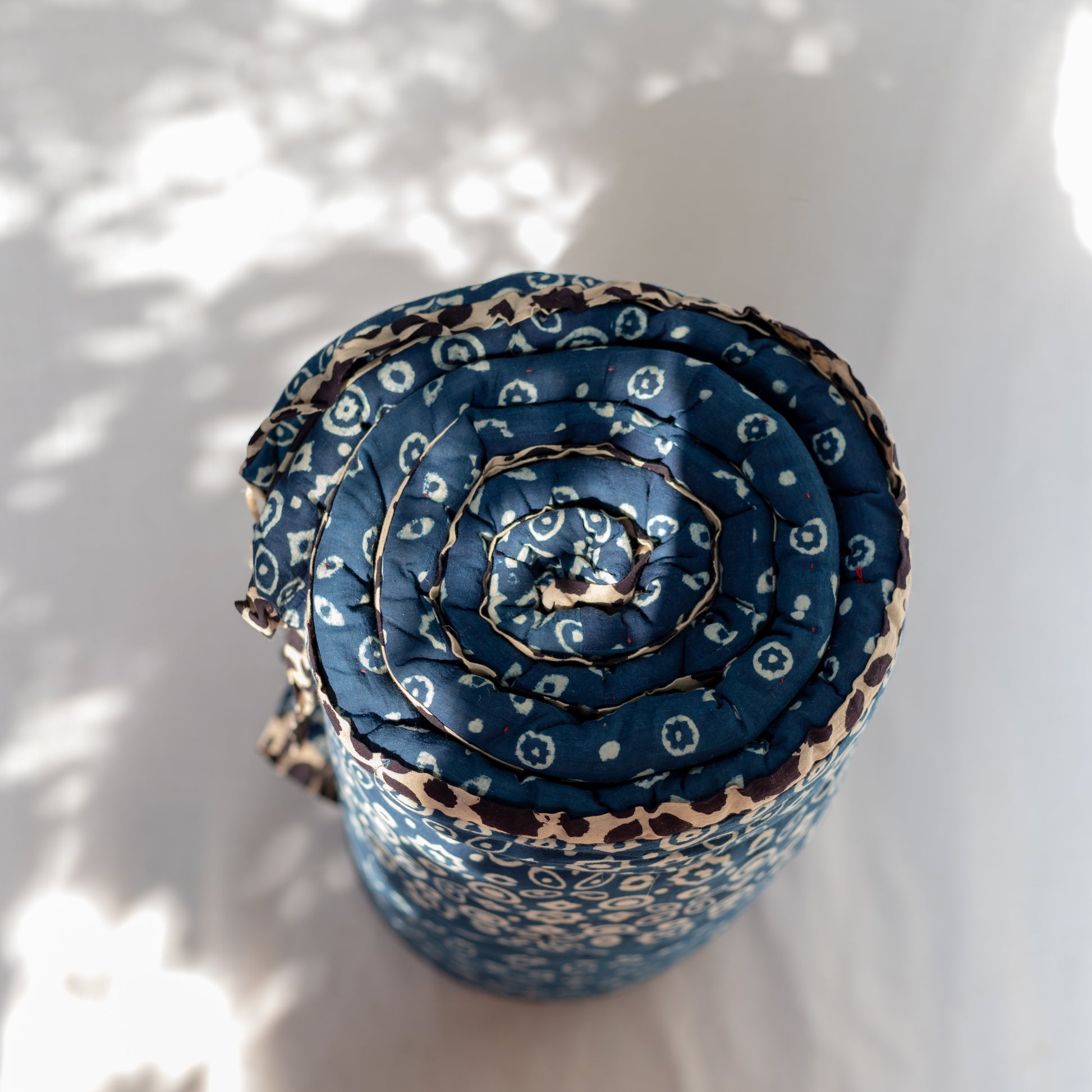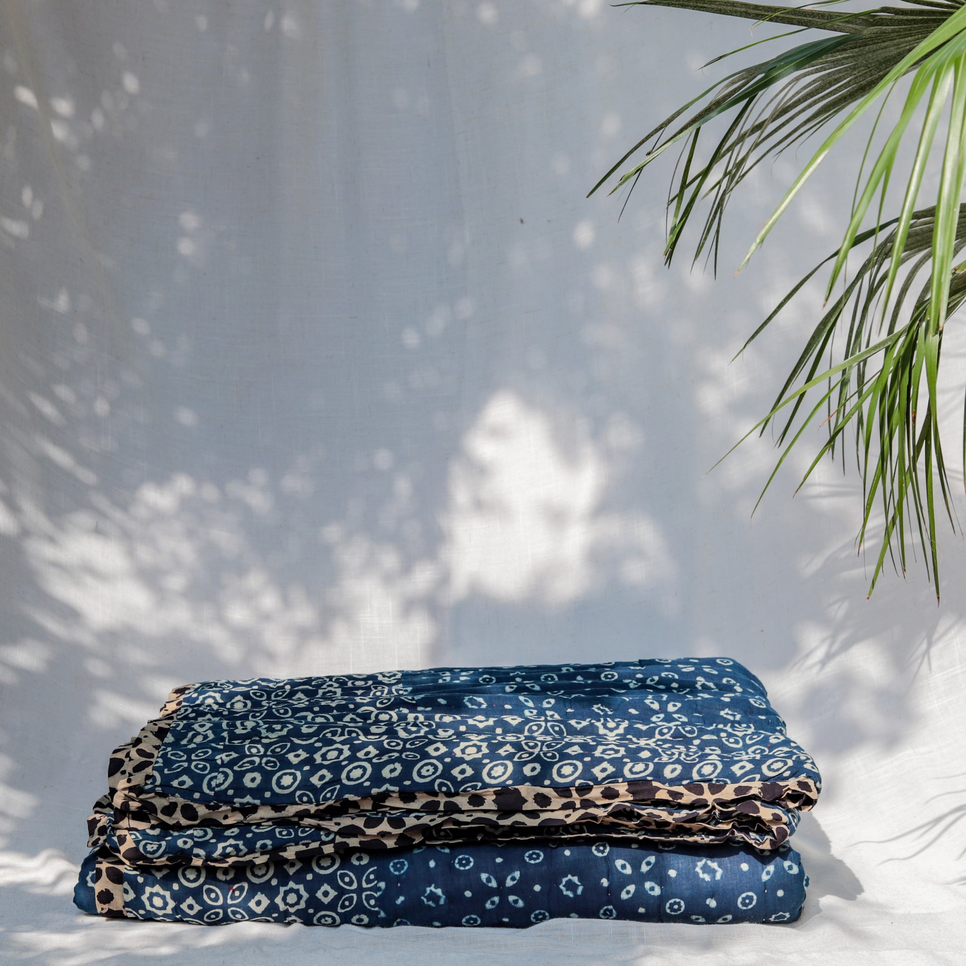 An indigo cotton dulai with intricate starry and floral block prints, bringing heritage craft to your home. Soft, warm, and versatile — perfect for all seasons. Handmade with dedication by rural female artisans.