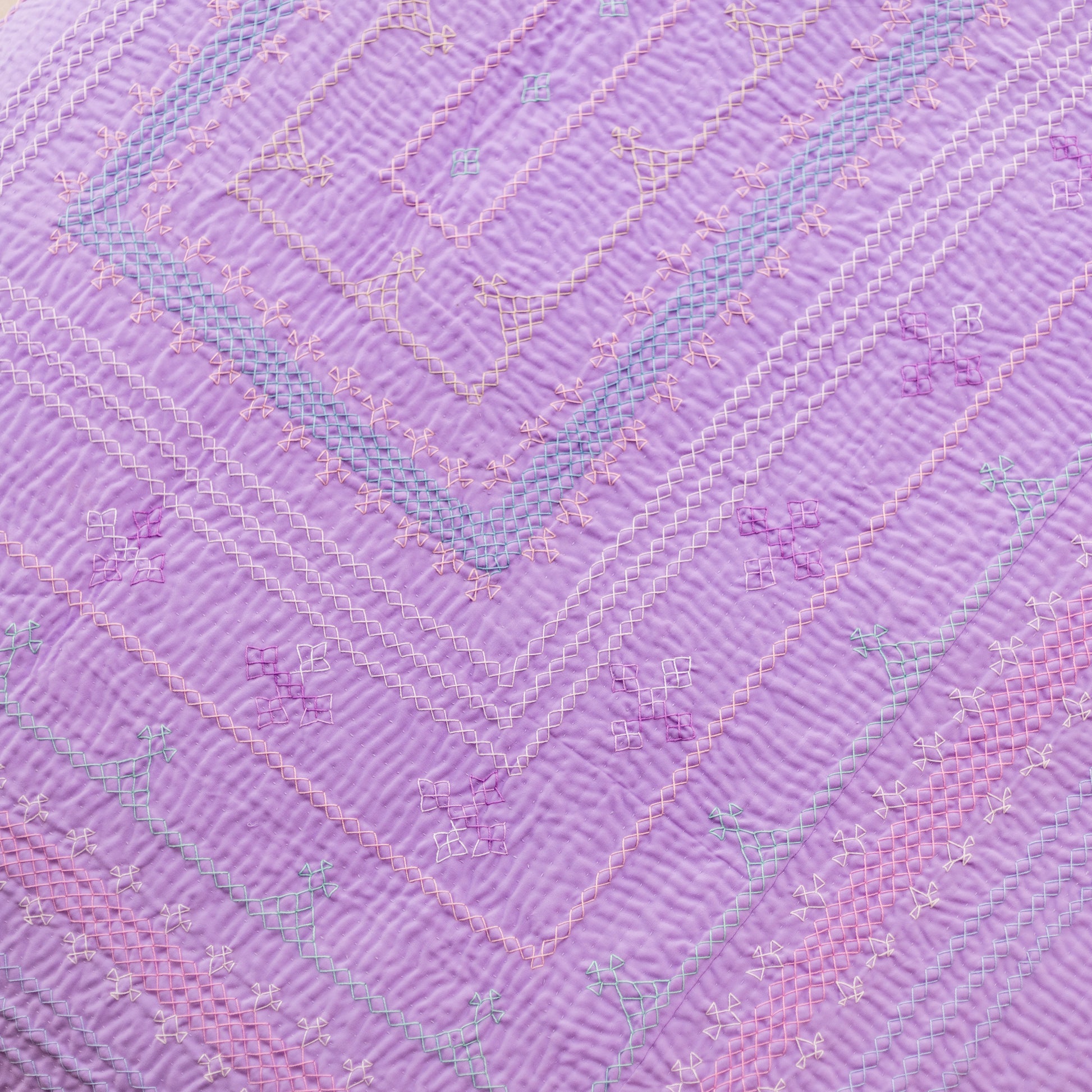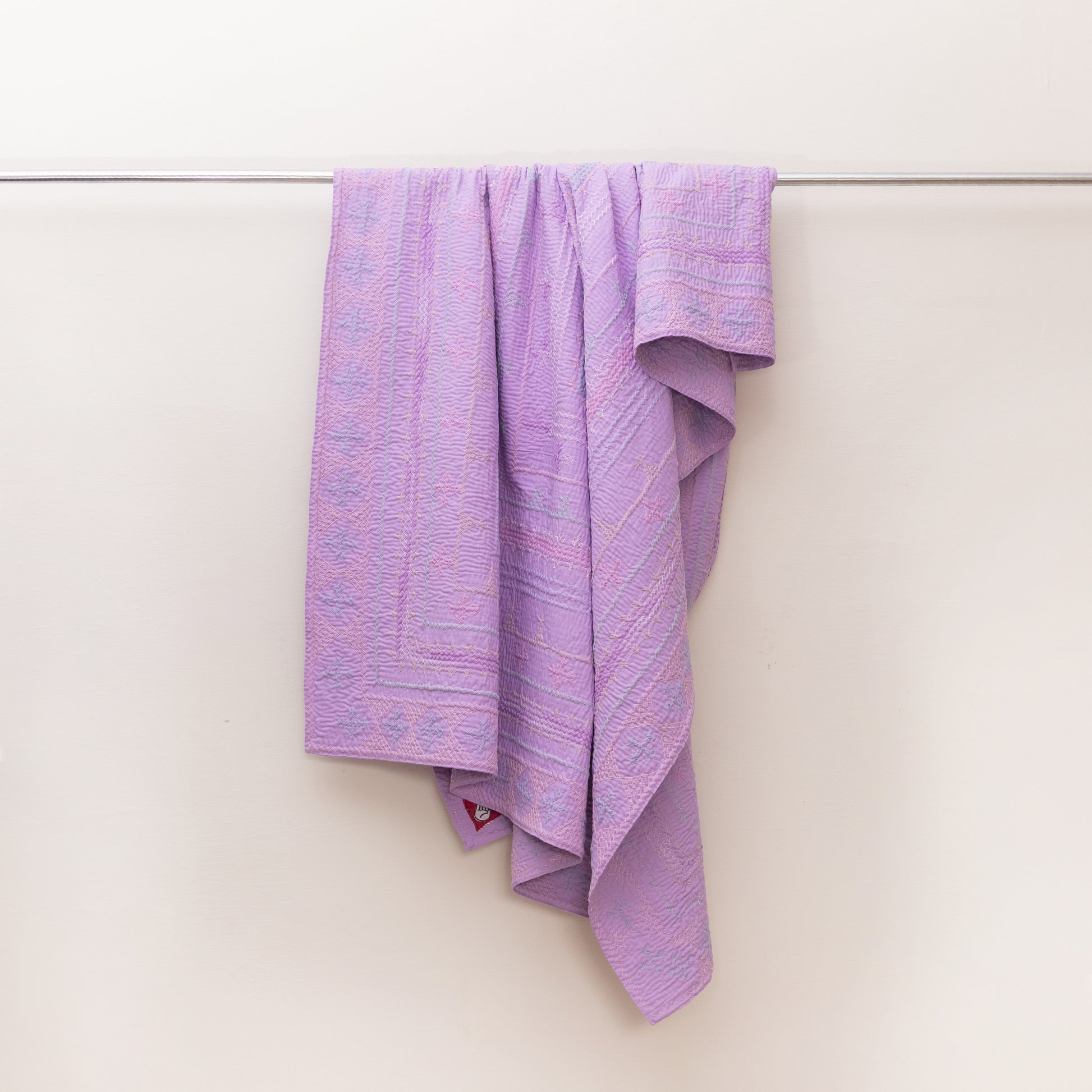 A soothing hand-stitched rilli quilt in soft lavender-sage tones, detailed with delicate traditional embroidery. Its calming hues and intricate design make it perfect for layering on your bed or using as a lightweight cover.