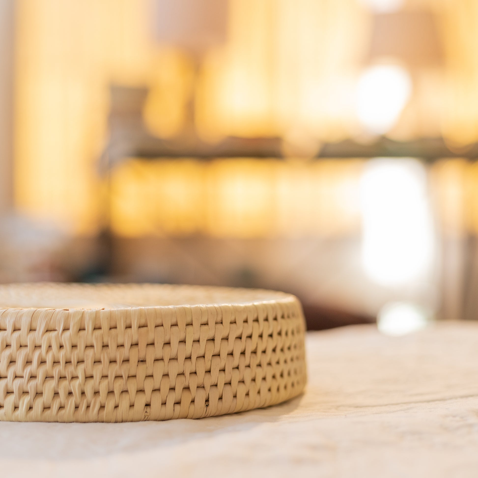 Delicately handwoven by rural artisans, this mini tray basket blends form and function with natural finesse. Crafted from date palm leaves, it’s perfect for holding trinkets or serving with quiet elegance. A simple piece that speaks of tradition and thoughtful living . Handmade by Rural female Artisans