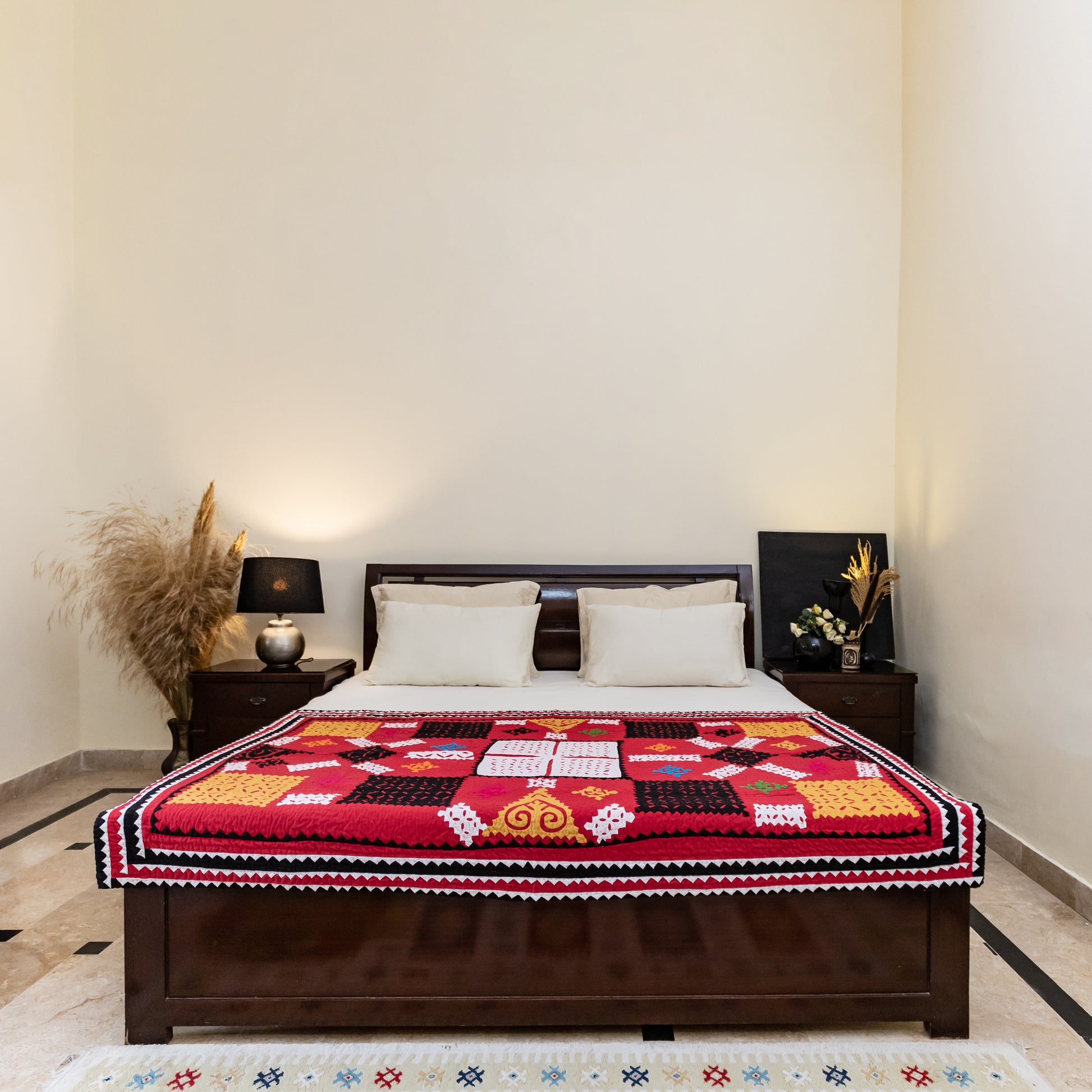 Our most loved design, the MKK Appliqué Rilli is a striking blend of heritage and bold artistry. Intricately hand-appliquéd in vivid red, black, and white, with an earthy orange back printed in tribal-inspired motifs—this reversible masterpiece brings timeless tradition to modern spaces. Handmade by rural female artisans.