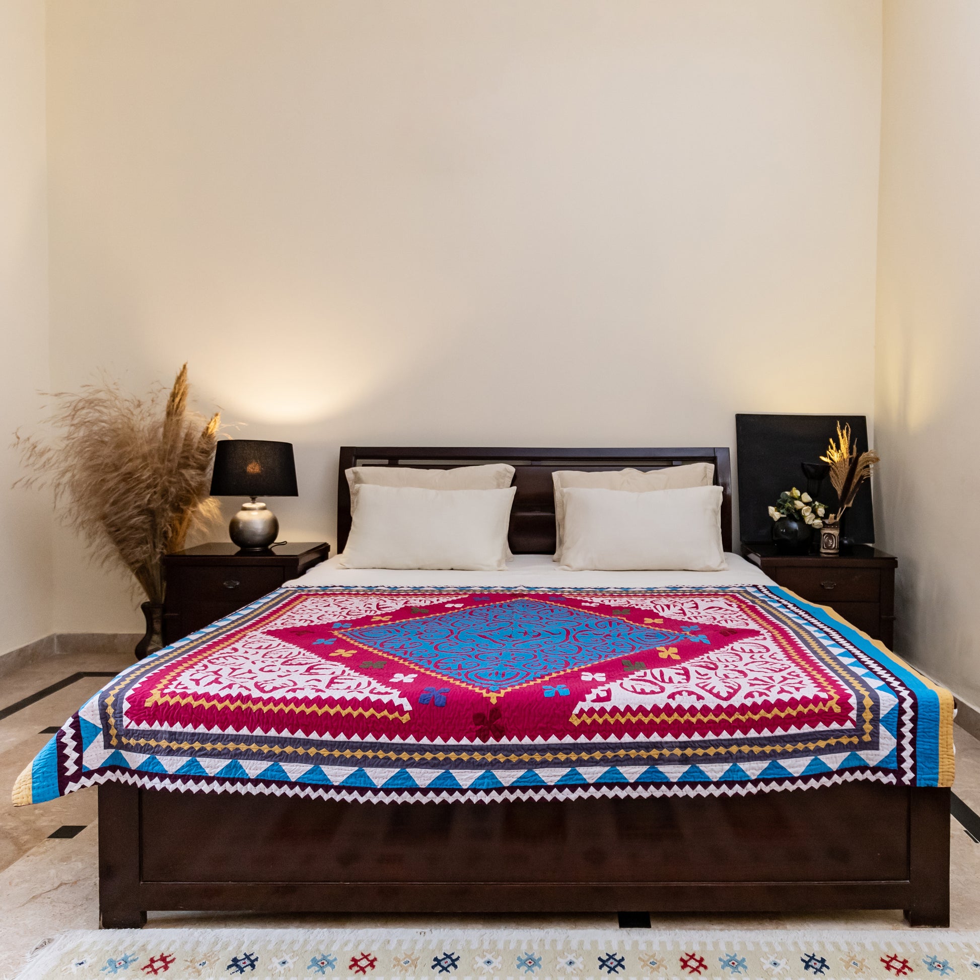 A celebration of vibrant craftsmanship, this MKK Appliqué Rilli features bold hand-appliquéd motifs in rich pink, turquoise blue, and mustard. The reverse side reveals a playful pink floral print in pink offering a beautifully reversible design with heritage appeal. A true statement piece for your home. Handmade by rural female artisans.