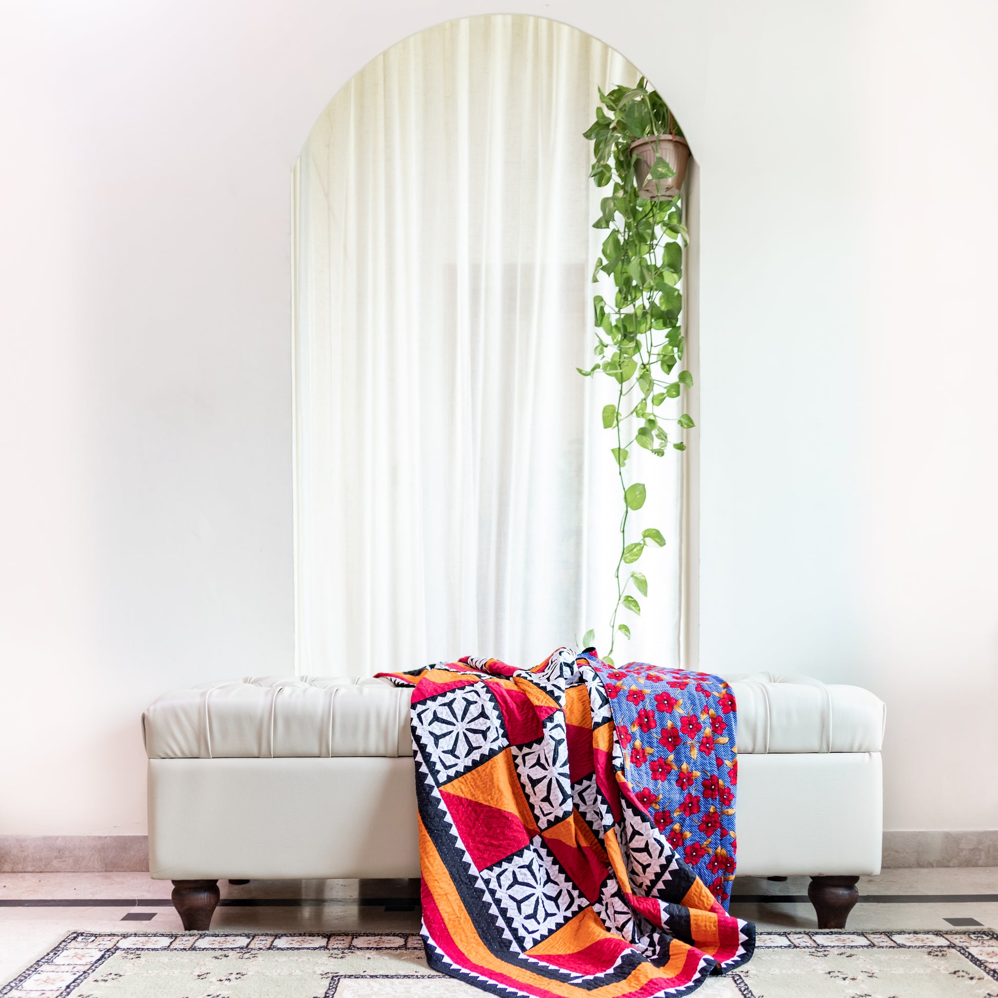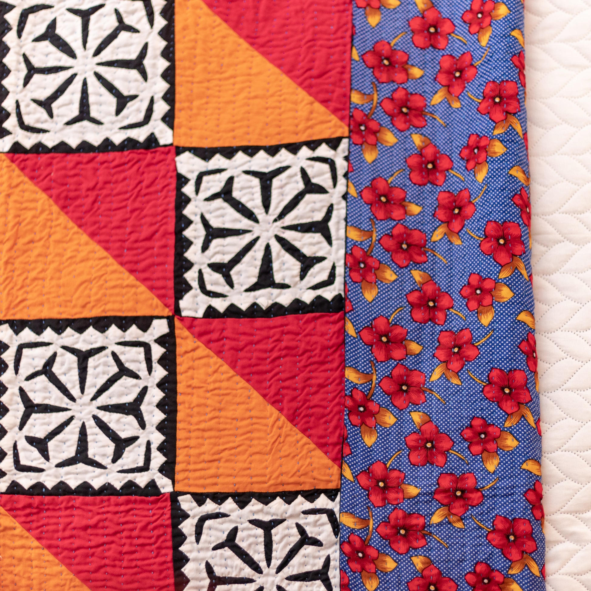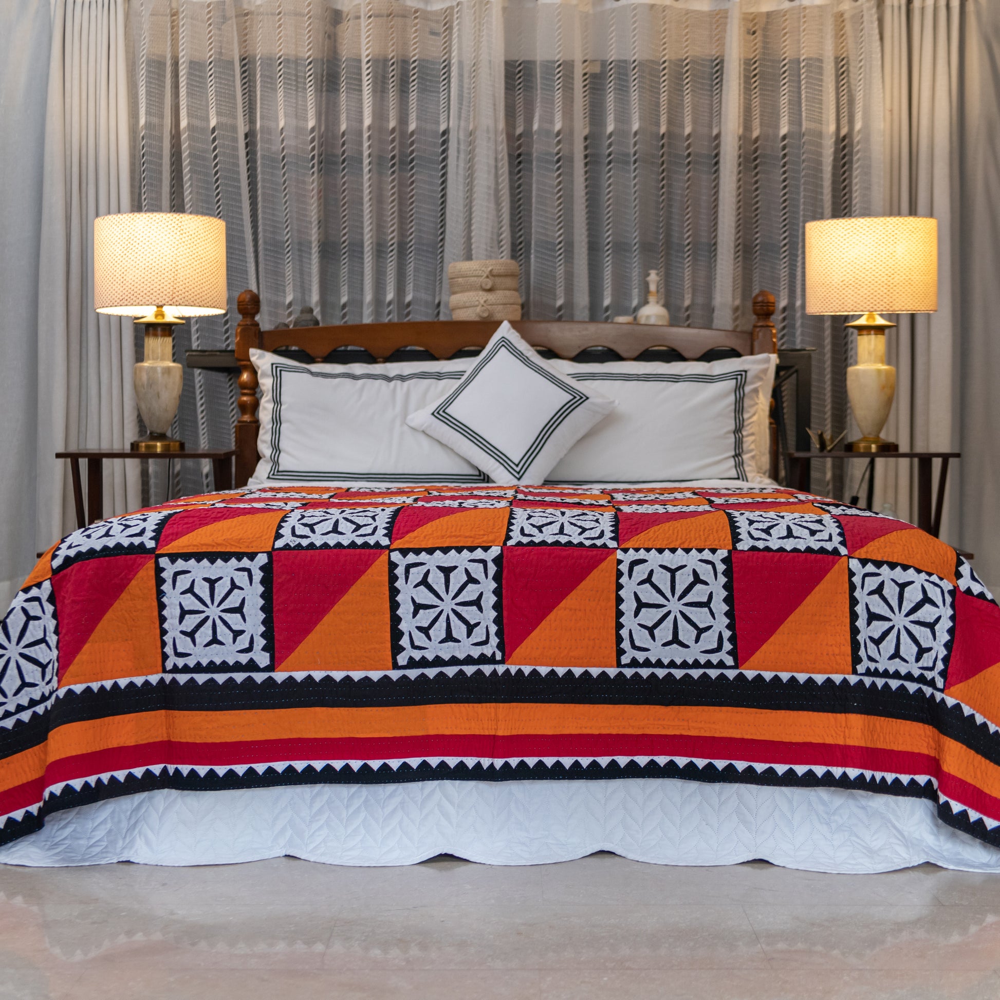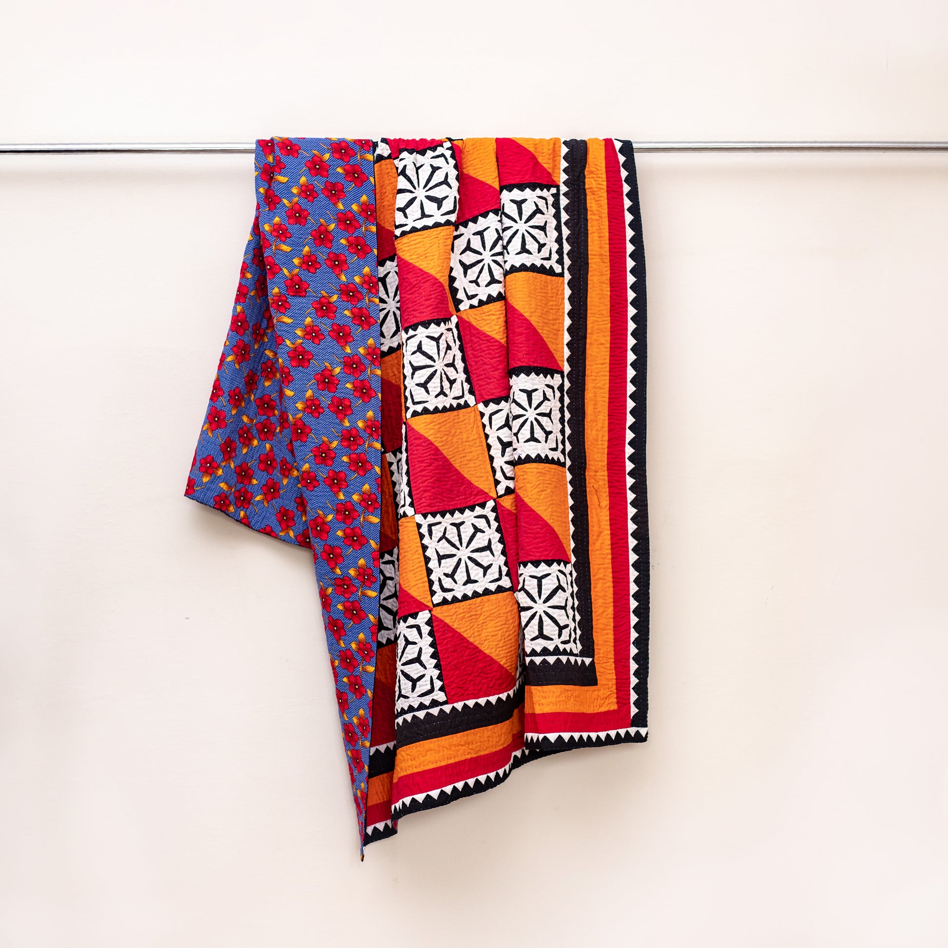 MKK Rilli in bold red, orange, and black geometric patchwork.