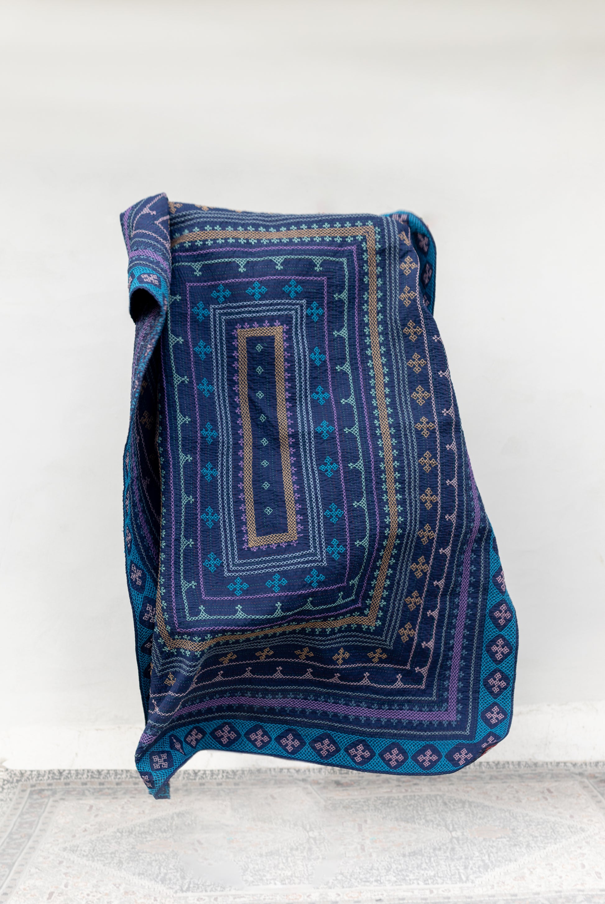 This stunning Sage Rilli is a hand-stitched Sindhi quilt in a rich navy blue, beautifully accented with a bold blue border. Intricate geometric patterns in shades of indigo, teal, and purple bring depth and vibrance to this striking twin-sized piece.