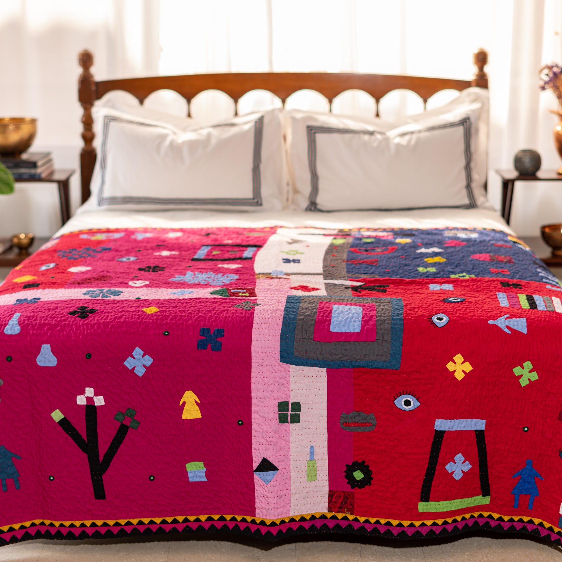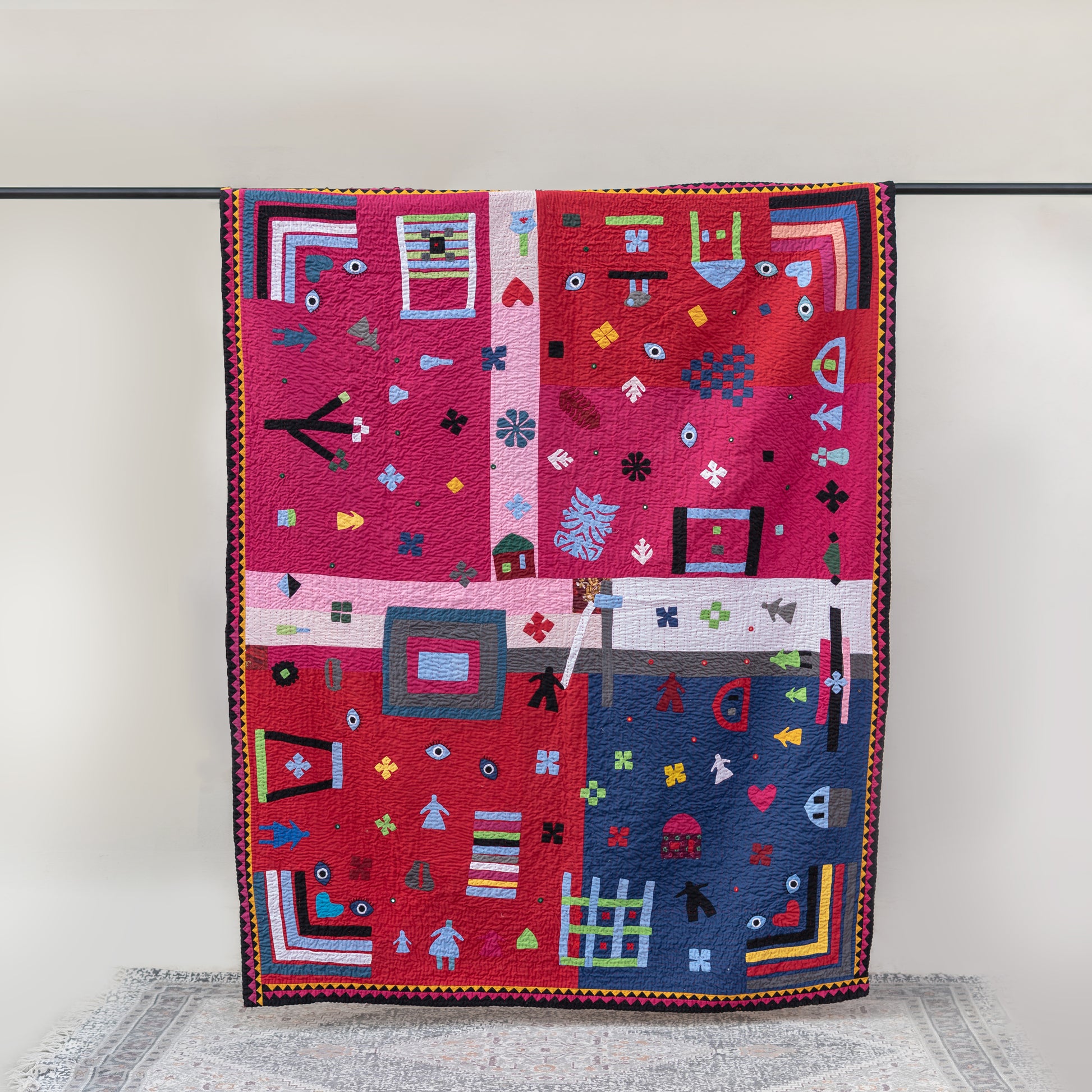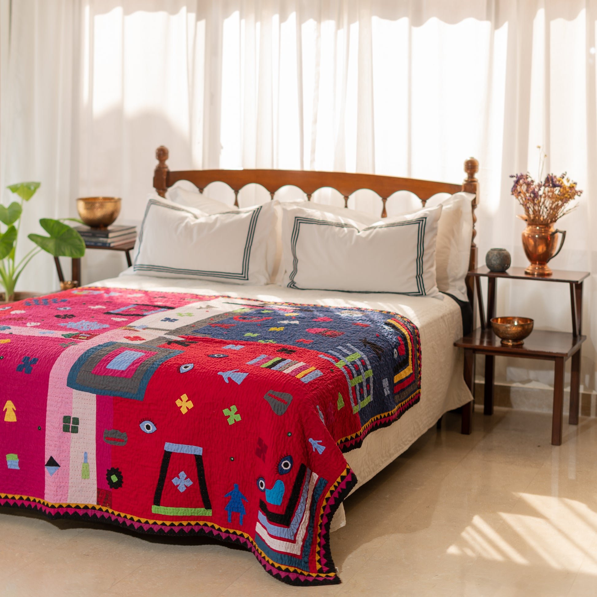 A vibrant celebration of imagination and tradition, the MKK Art Rilli Quilt combines bold colors and playful symbols inspired by Sindhi culture. Each patch is hand-cut and stitched, telling stories through shapes, hearts, eyes, and homes — blending folk motifs with modern creativity. Crafted with love and patience, this Rilli transforms any space into a canvas of color, warmth, and art.