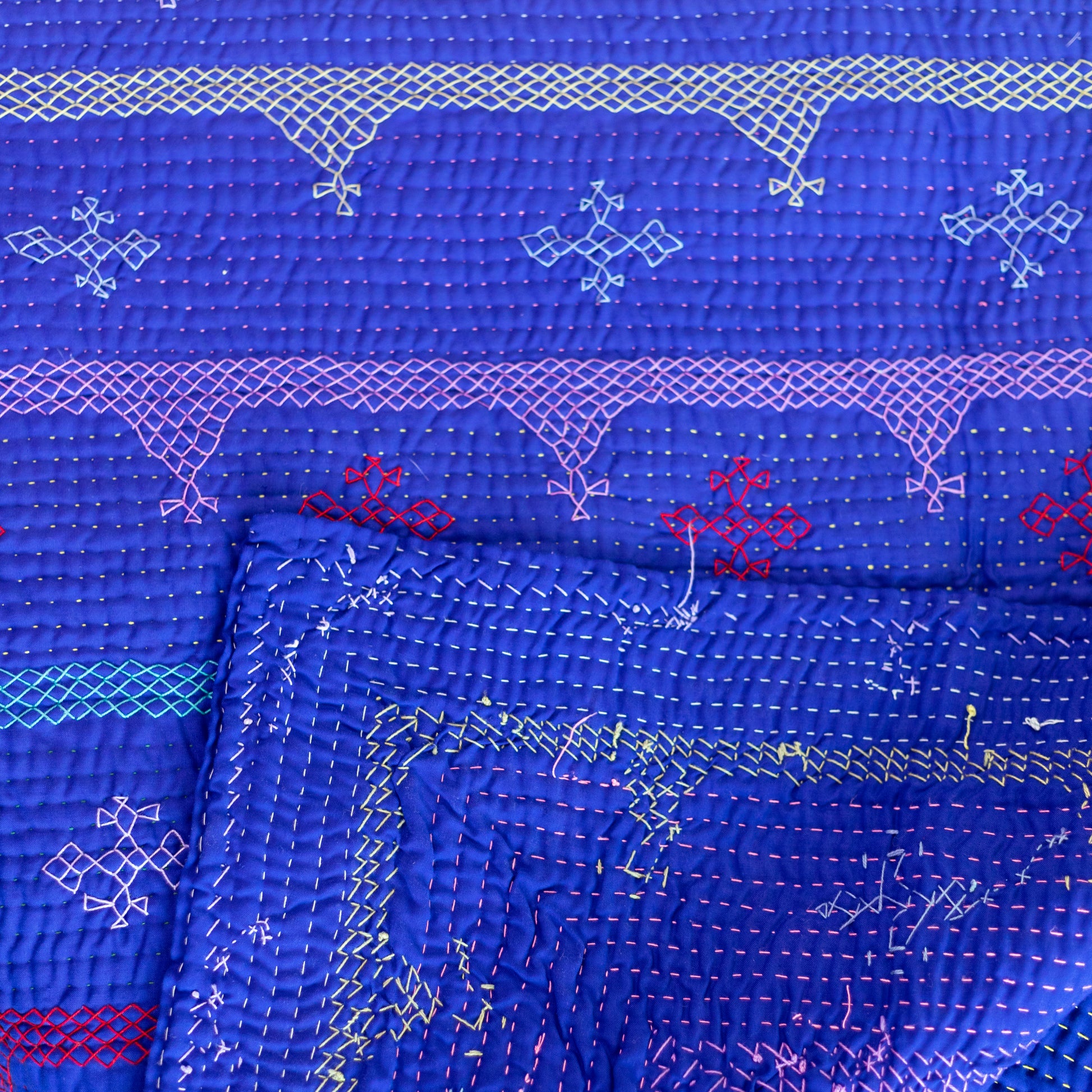 A striking cobalt blue Yogi Rilli throw, adorned with colorful hand-stitched embroidery in red, green, yellow, and lilac patterns. Handmade by rural female artisans, this piece adds a bold yet traditional touch to any space.