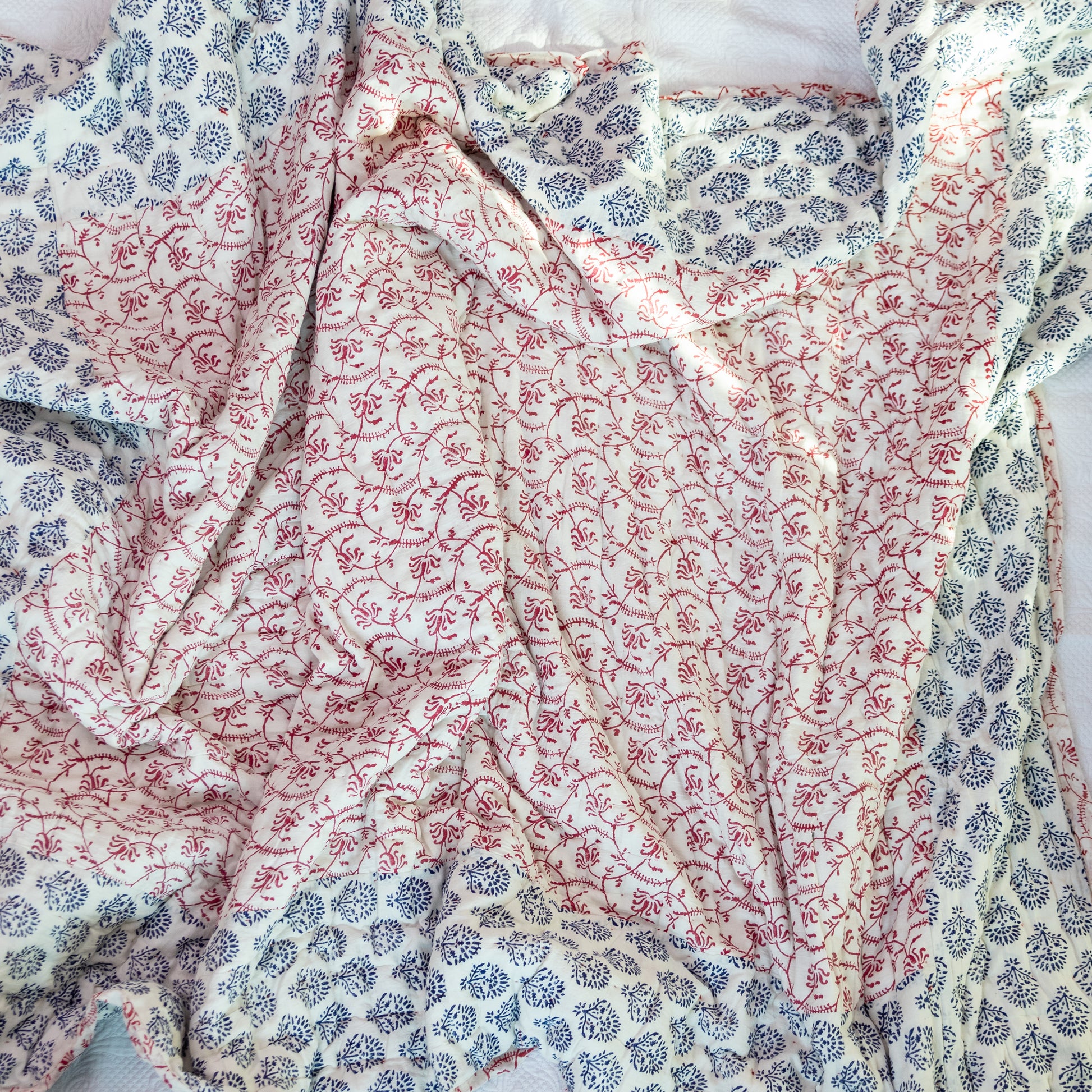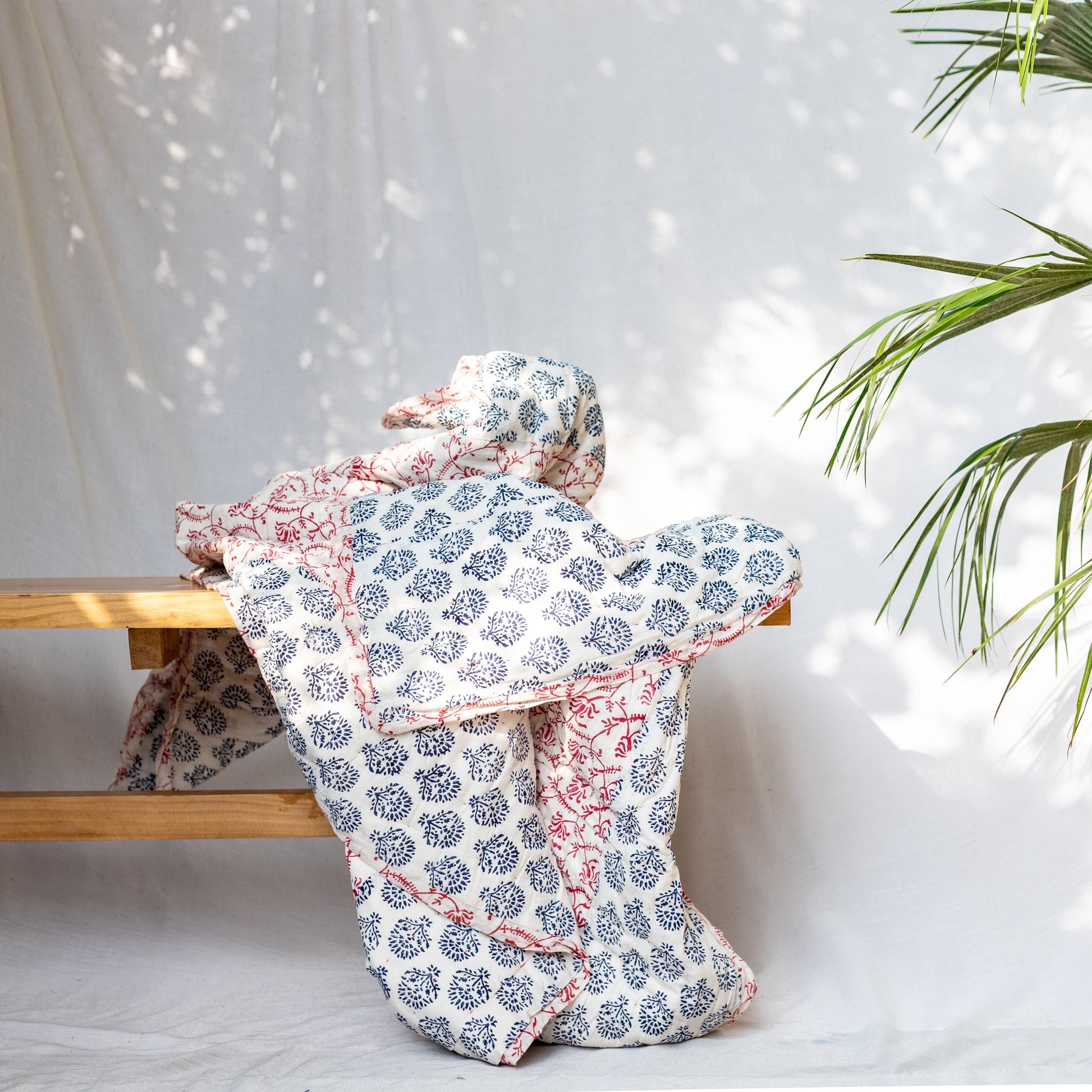 A soft and lightweight cotton dulai, hand-block printed with delicate red vines and navy floral patterns. Perfect for cozy evenings or layering with style. Handmade with care by rural female artisans.