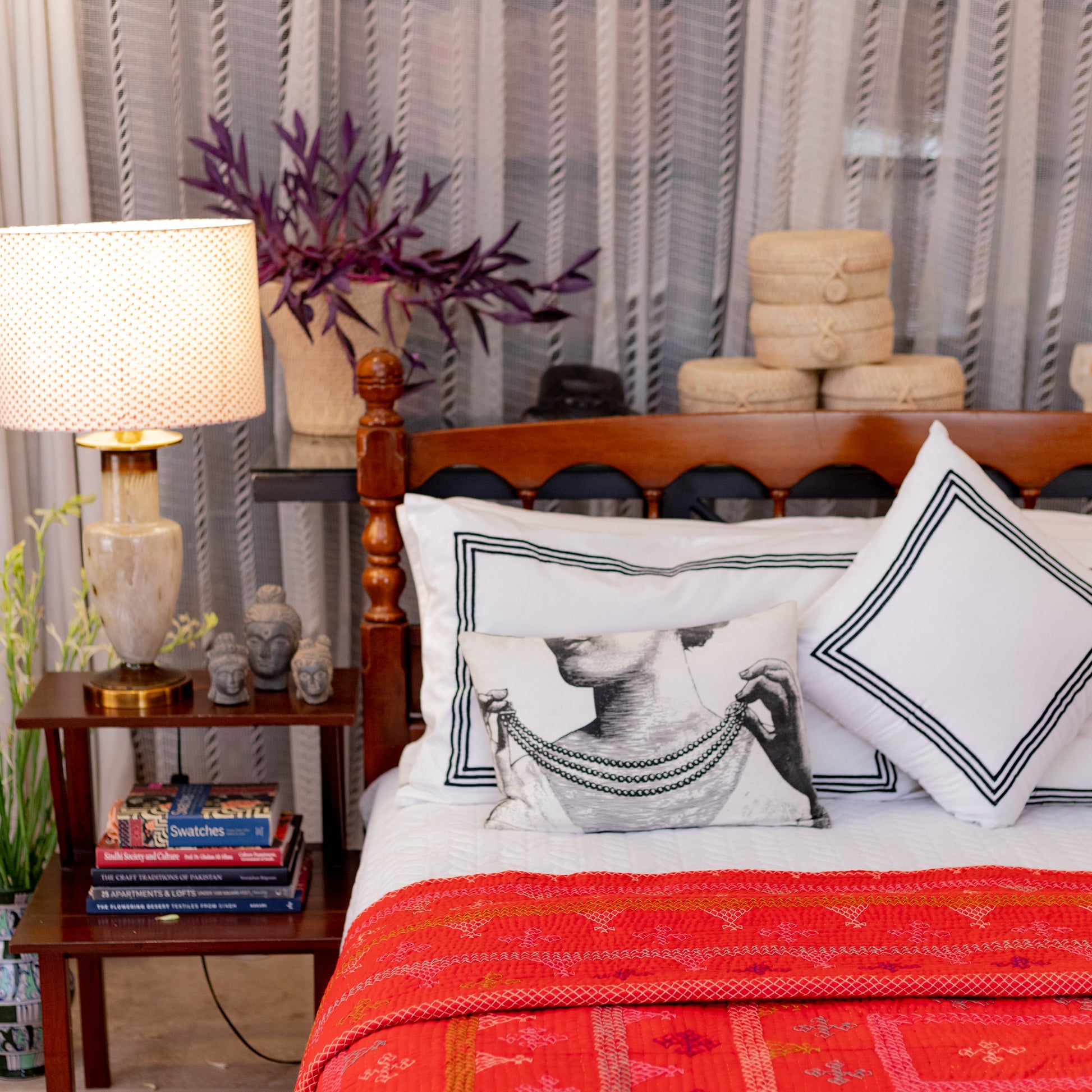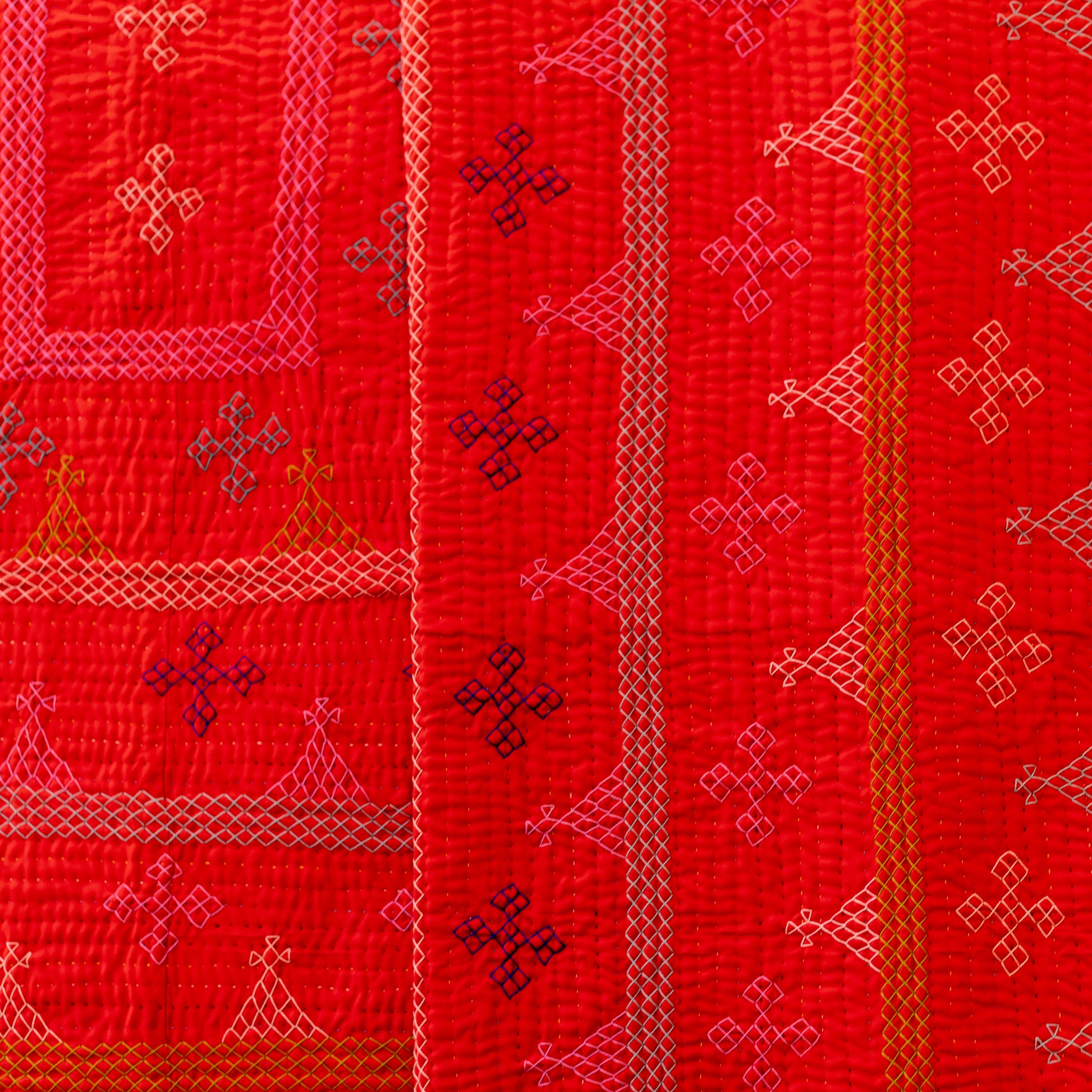 Bold and grounding, this hand-stitched Red Yogi Rilli radiates warmth through its fiery hue and rhythmic geometric motifs. The intricate thread work and rich color story bring a sense of heritage and celebration to any space. A striking layer or a statement bedspread for vibrant interiors.