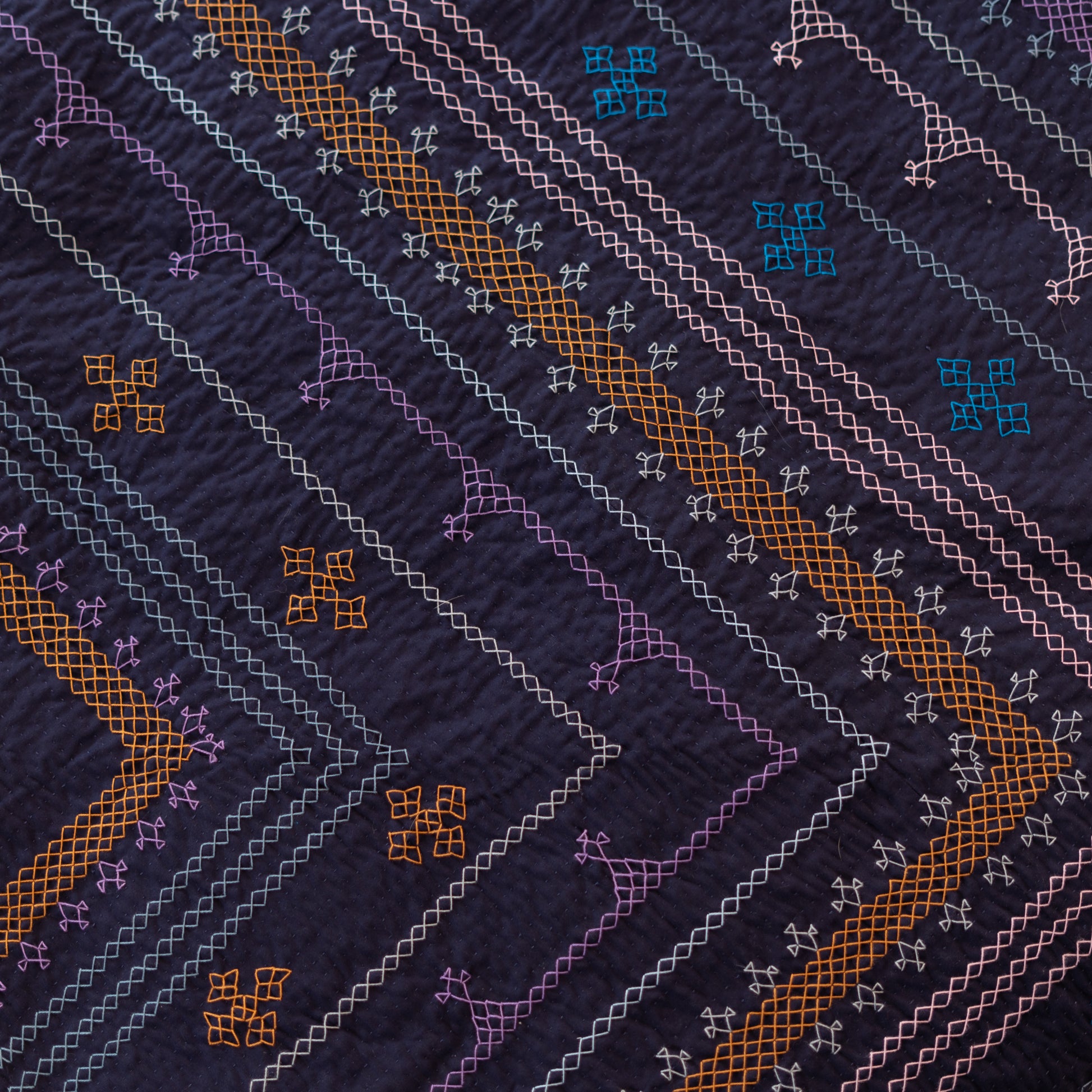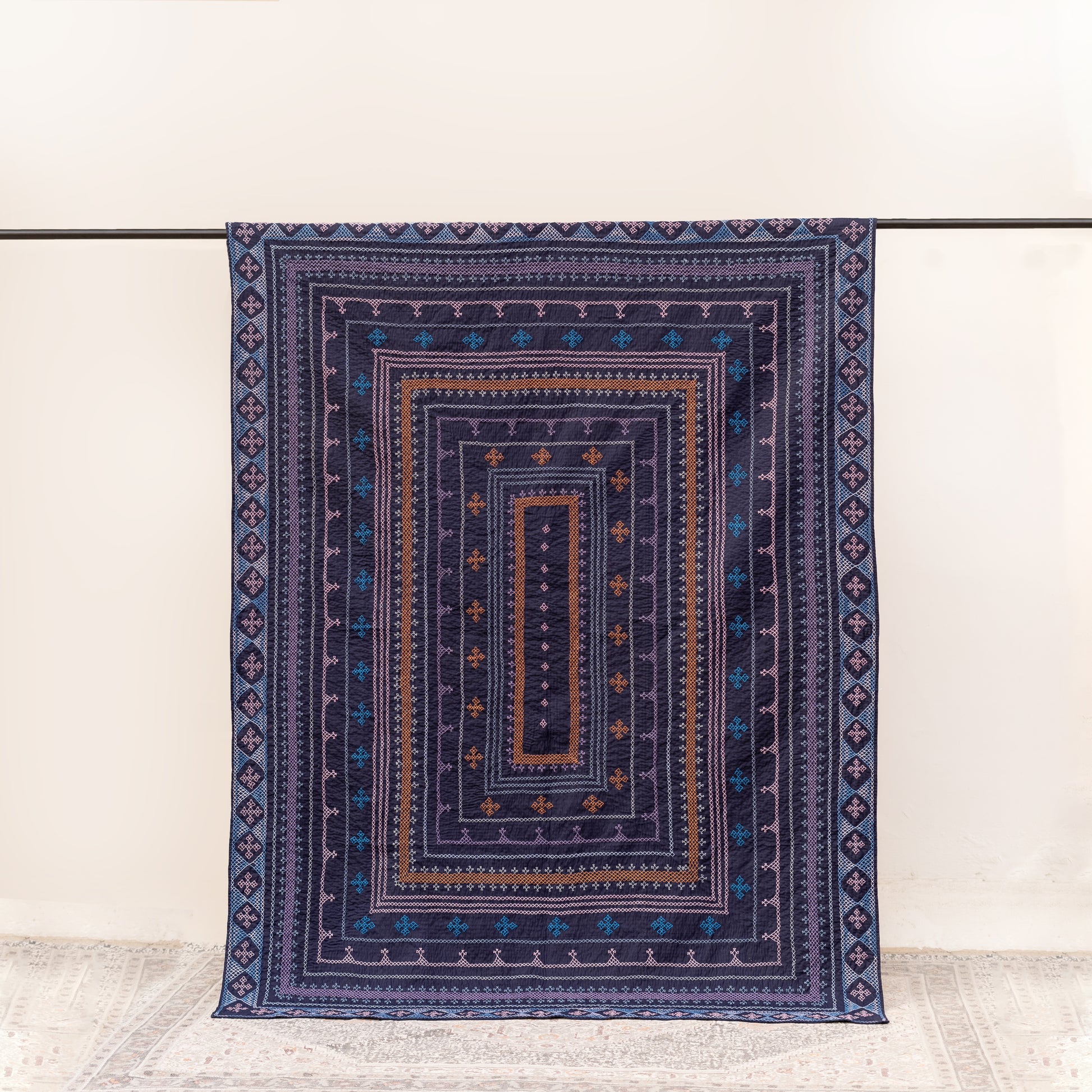 A stunning blend of deep navy, earthy brown, and hints of sage blue — this hand-stitched Rilli quilt captures the timeless rhythm of Sindhi craftsmanship.