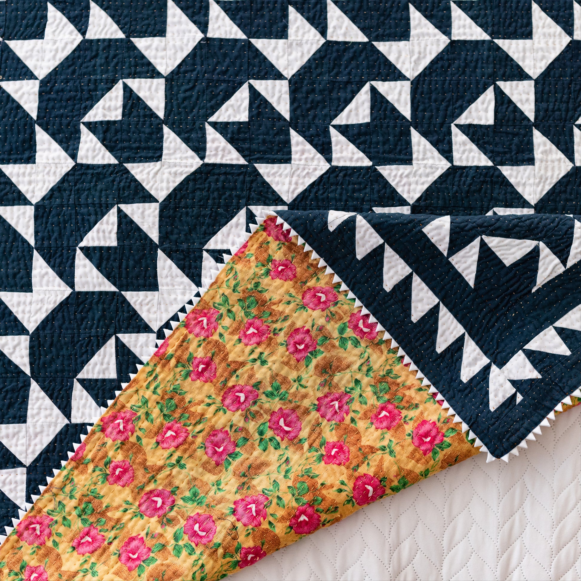A striking Sail Boat Rilli in classic navy and white, featuring bold geometric patterns on the front. The reverse side showcases a warm mustard floral print with vibrant pink blossoms. A beautiful, versatile throw—handmade by rural female artisans
