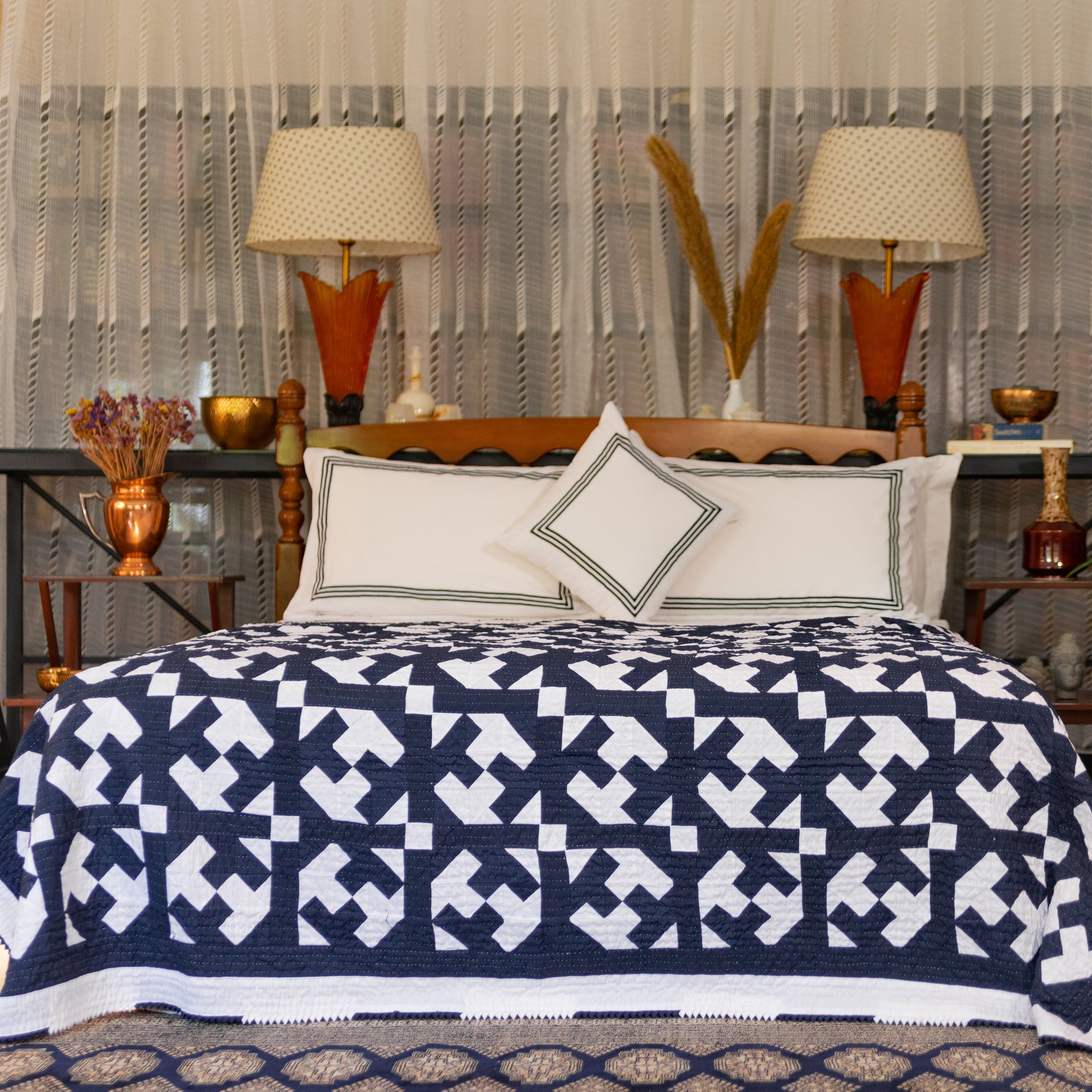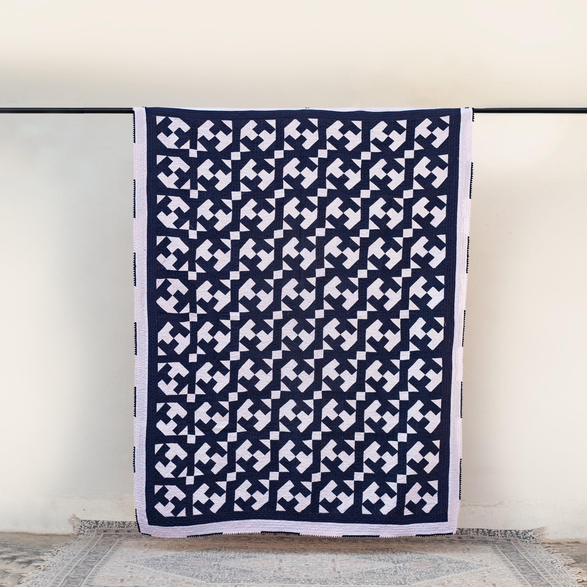 A classic hand-stitched patchwork rilli in navy blue and white, designed in bold geometric patterns with fine running stitches. The front highlights timeless contrast, while the reverse side reveals a rich red floral print with blue, mustard, and green accents, making it a versatile two-in-one quilt. Handmade with care by rural female artisans of Sindh.