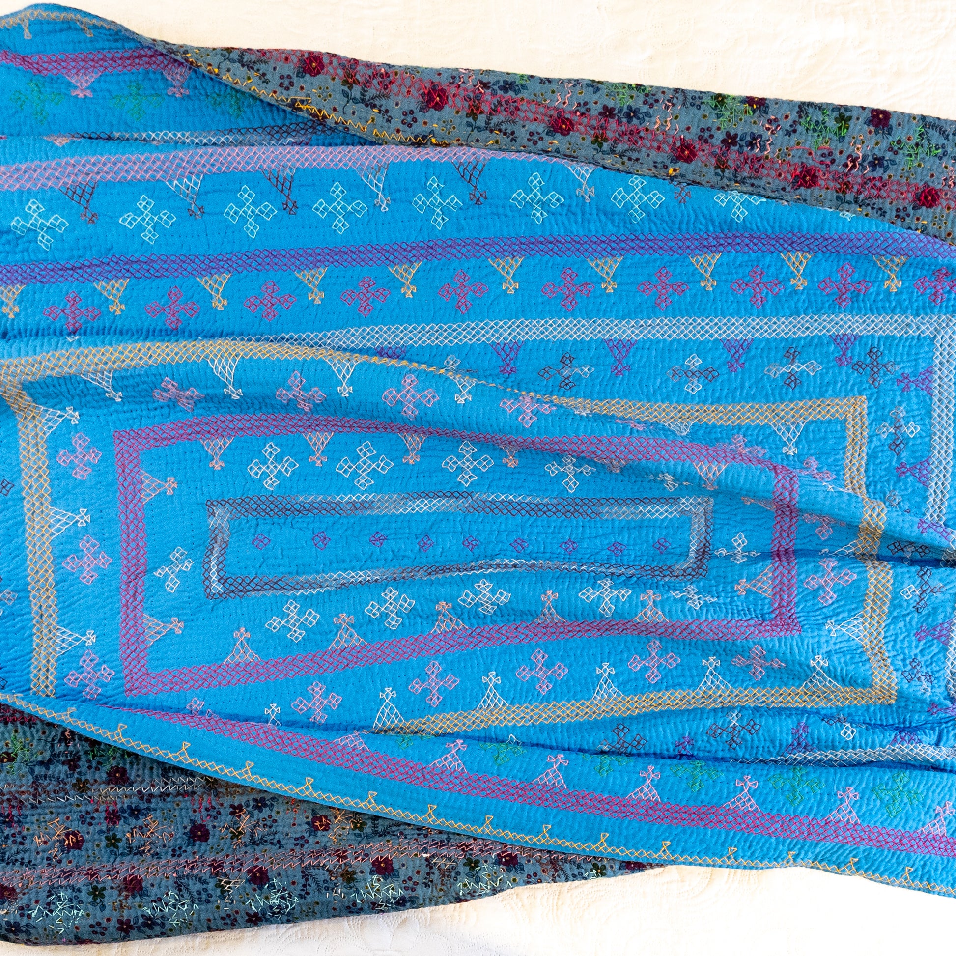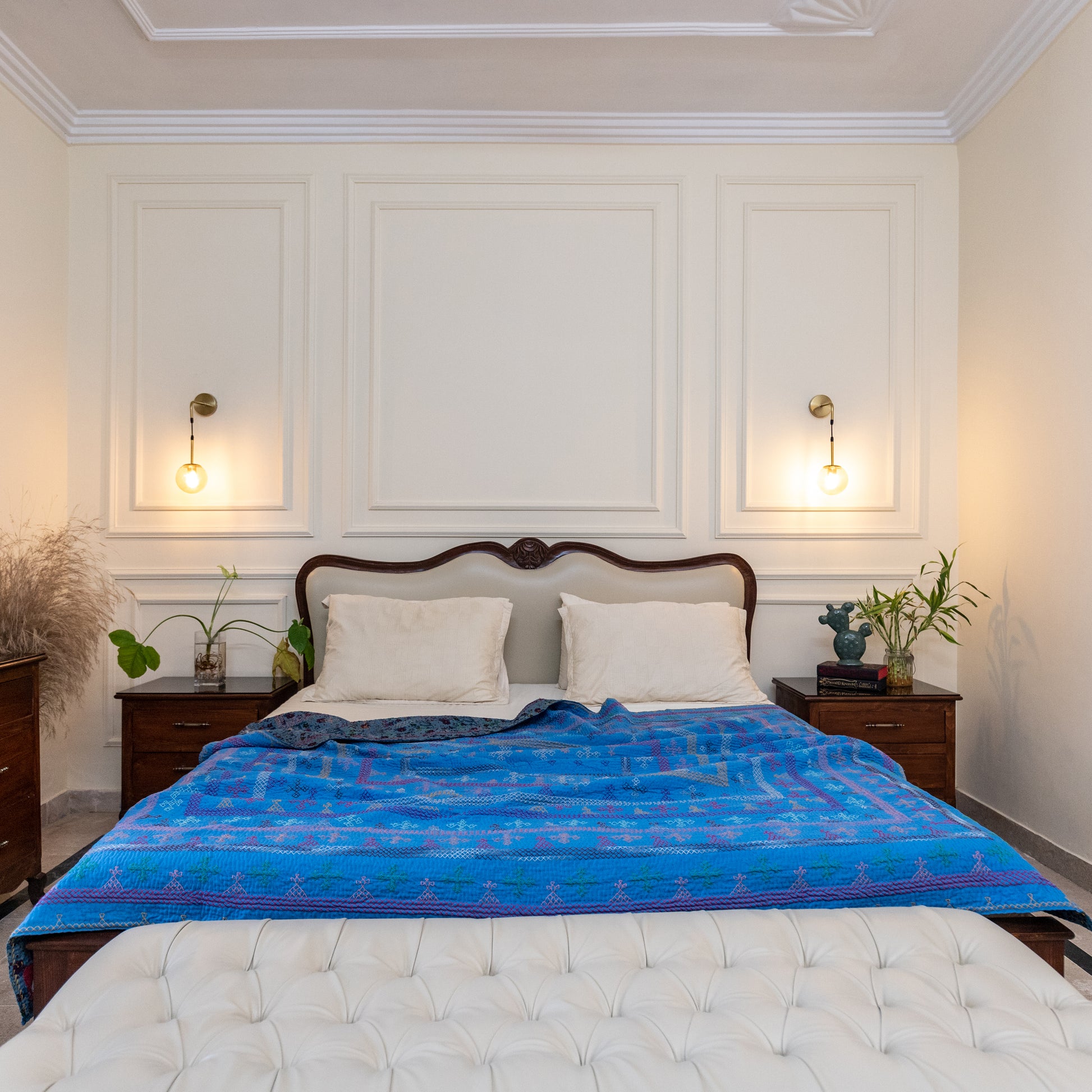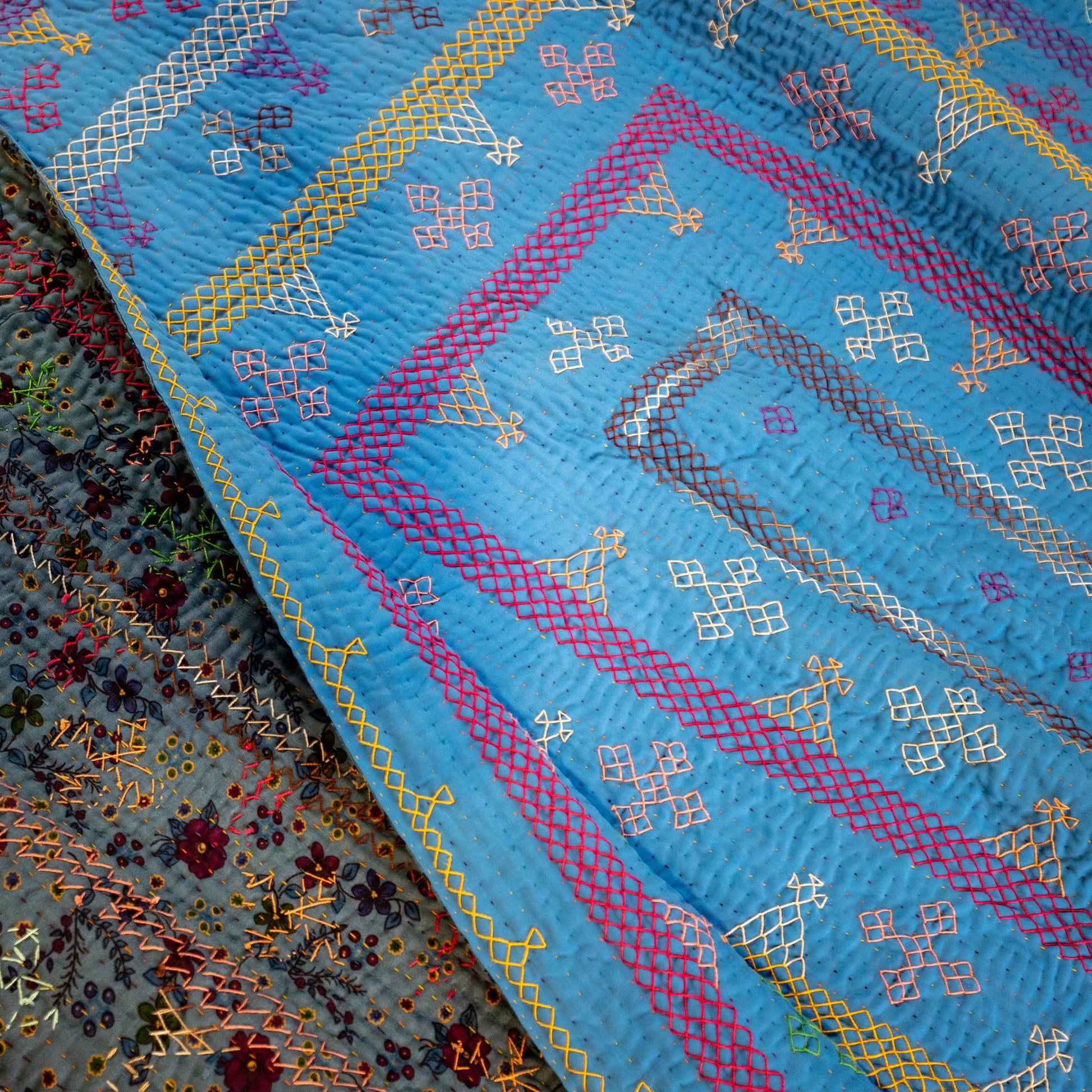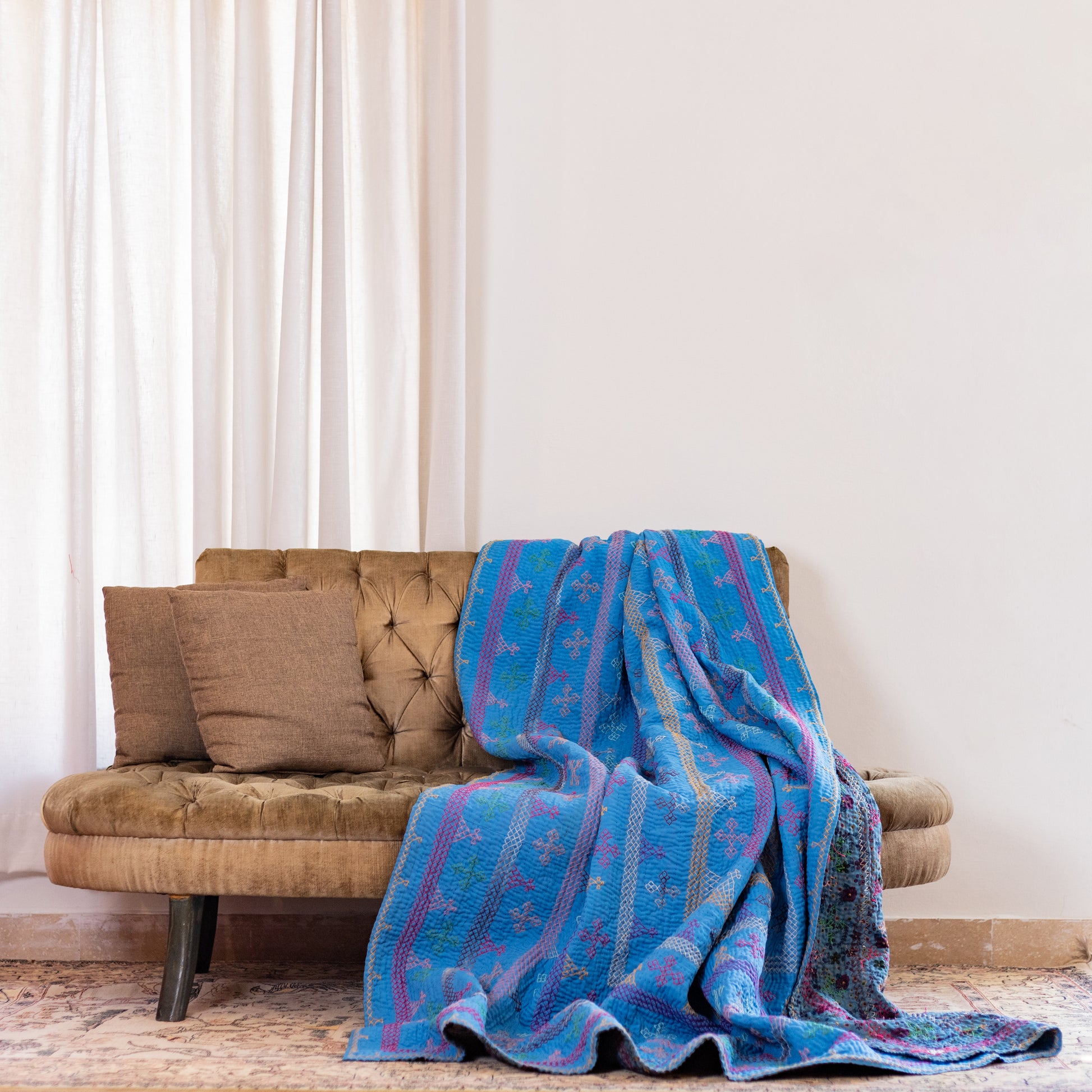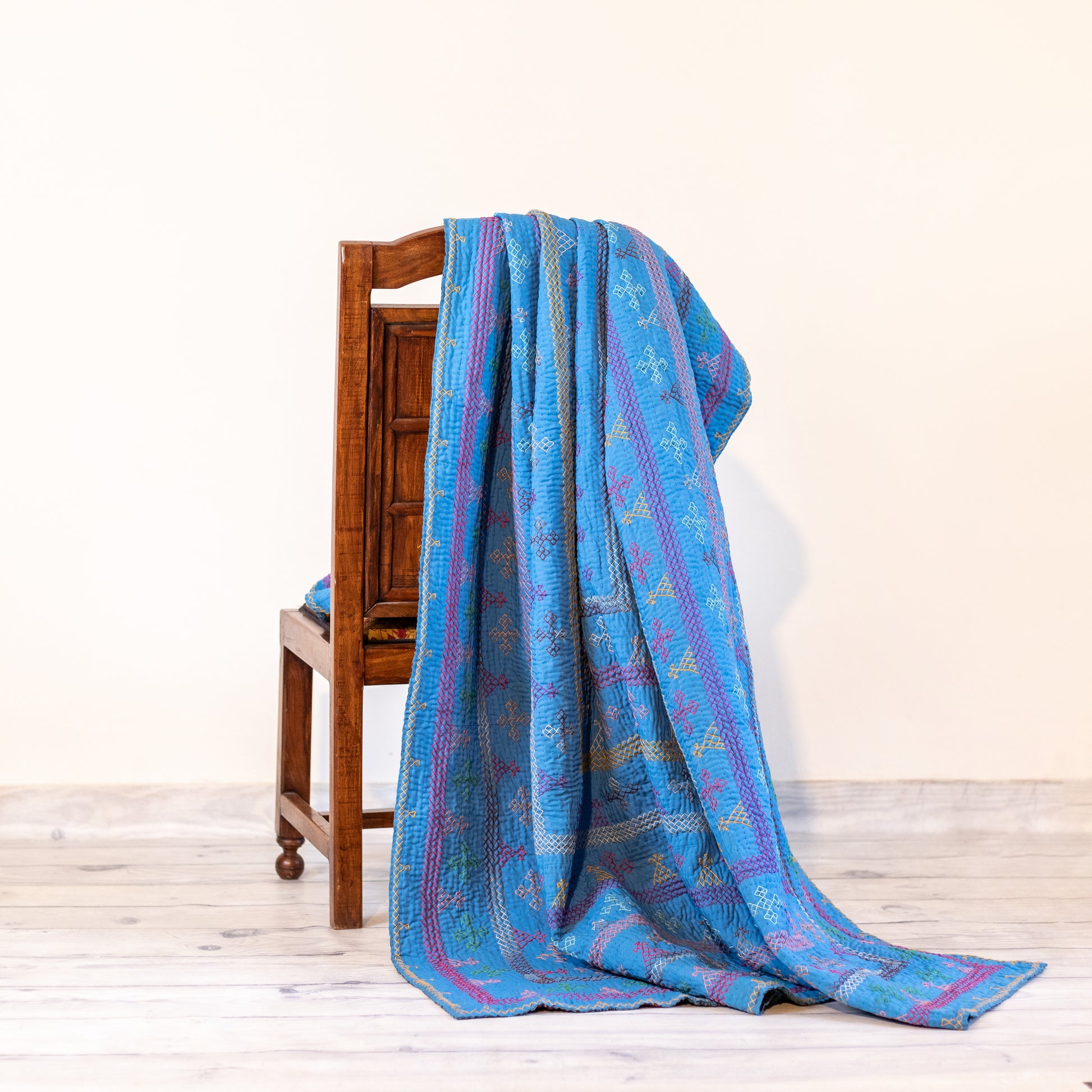 A rich tapestry of Blue—this backprinted Yogi Rilli is a celebration of color and quiet luxury. Lovingly stitched by women artisans, it brings warmth and story to your restful space. Handmade by Rural female Artisans