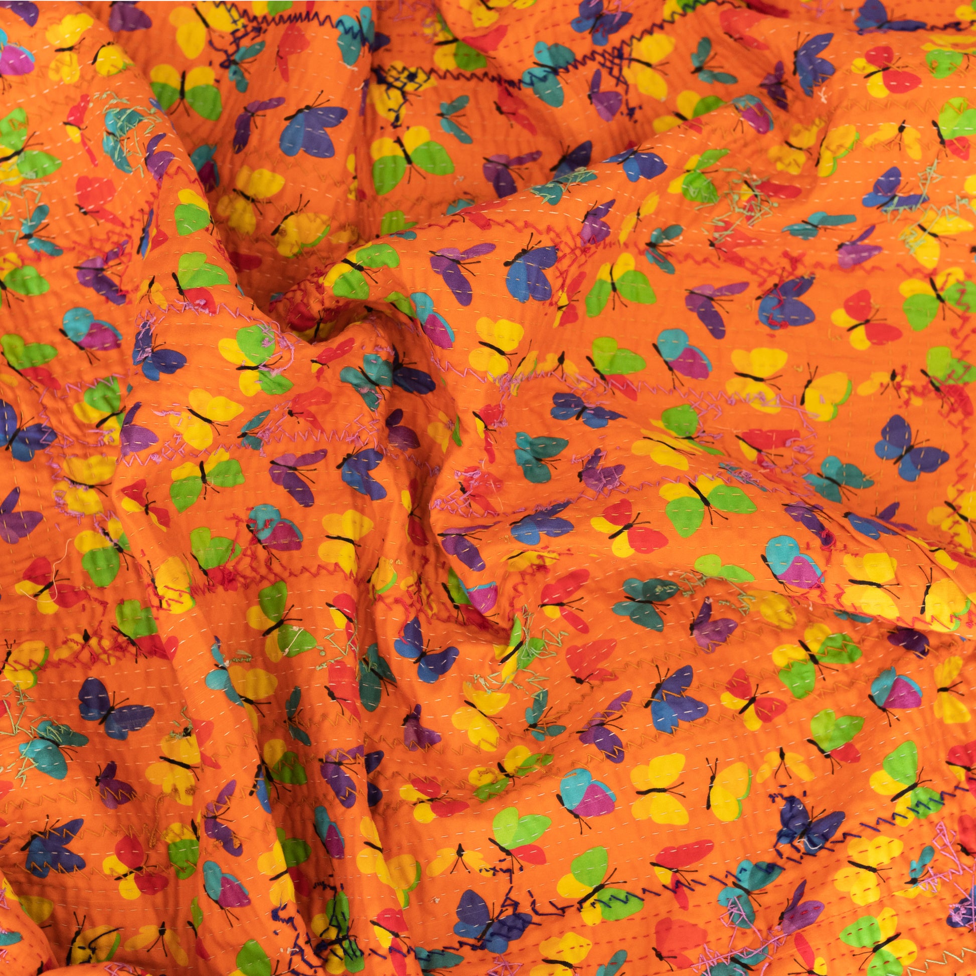 Brighten your home with the vibrant charm of the Butterfly Back Printed Bliss Rilli Throw. This artisan-crafted piece features meticulous hand-stitching on both sides — one side adorned with a lively butterfly pattern on a bold orange base, and the reverse side showcasing delicate geometric embroidery in soft Sky-Blue and multicolored threads. A true expression of traditional craftsmanship, it's perfect for adding a pop of personality to your space or gifting with heart Handmade by Rural female Artisans