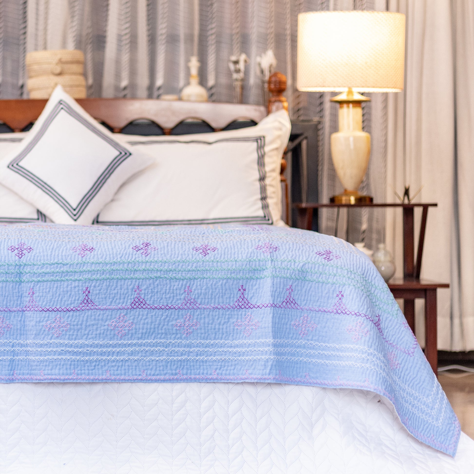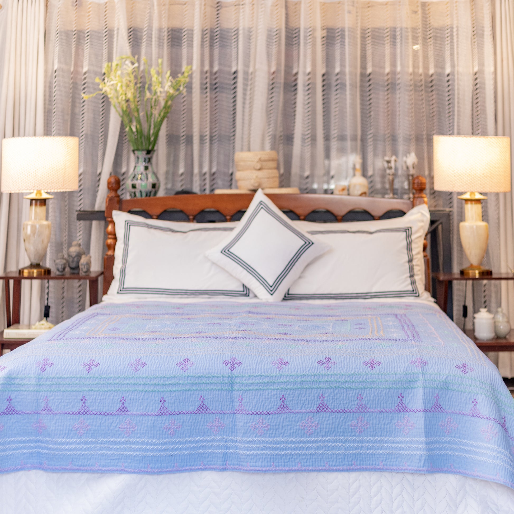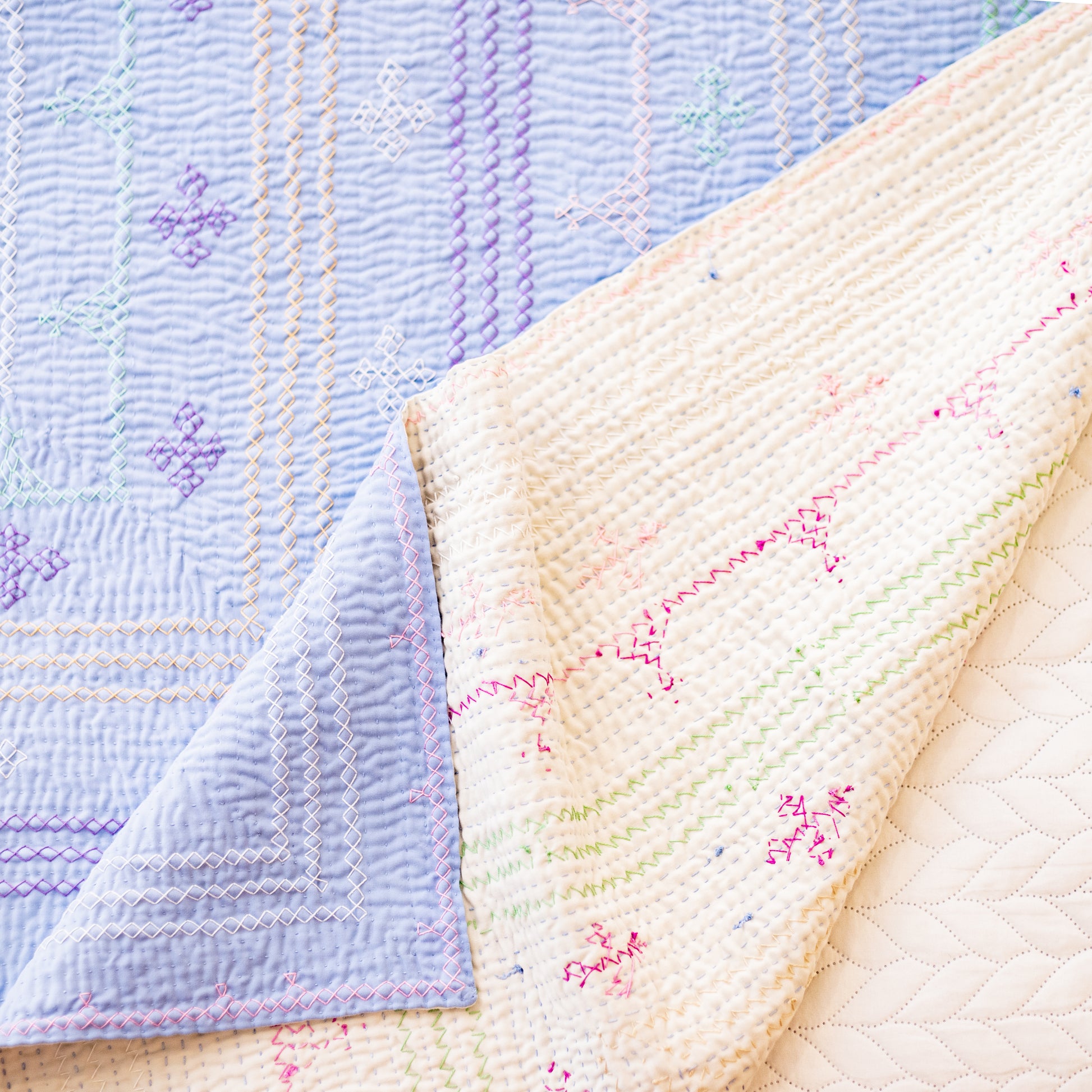 With a dreamy sky blue front delicately hand-stitched in soft pastel threads, this J Rilli brings a sense of lightness and calm. The reverse is a classic white, offering a clean and timeless balance.