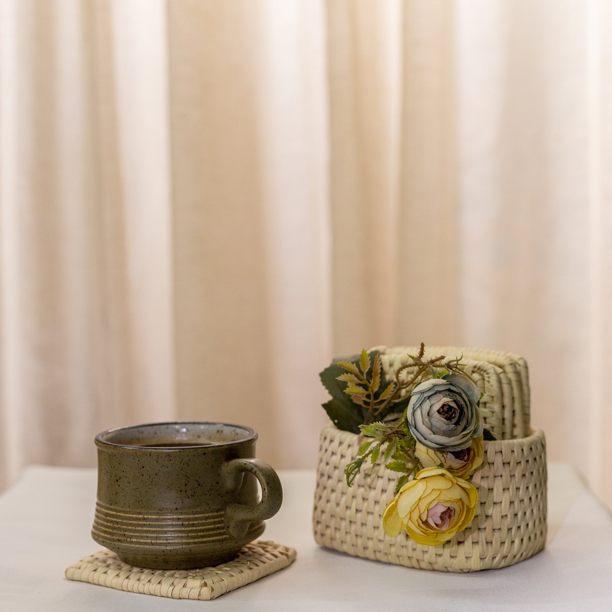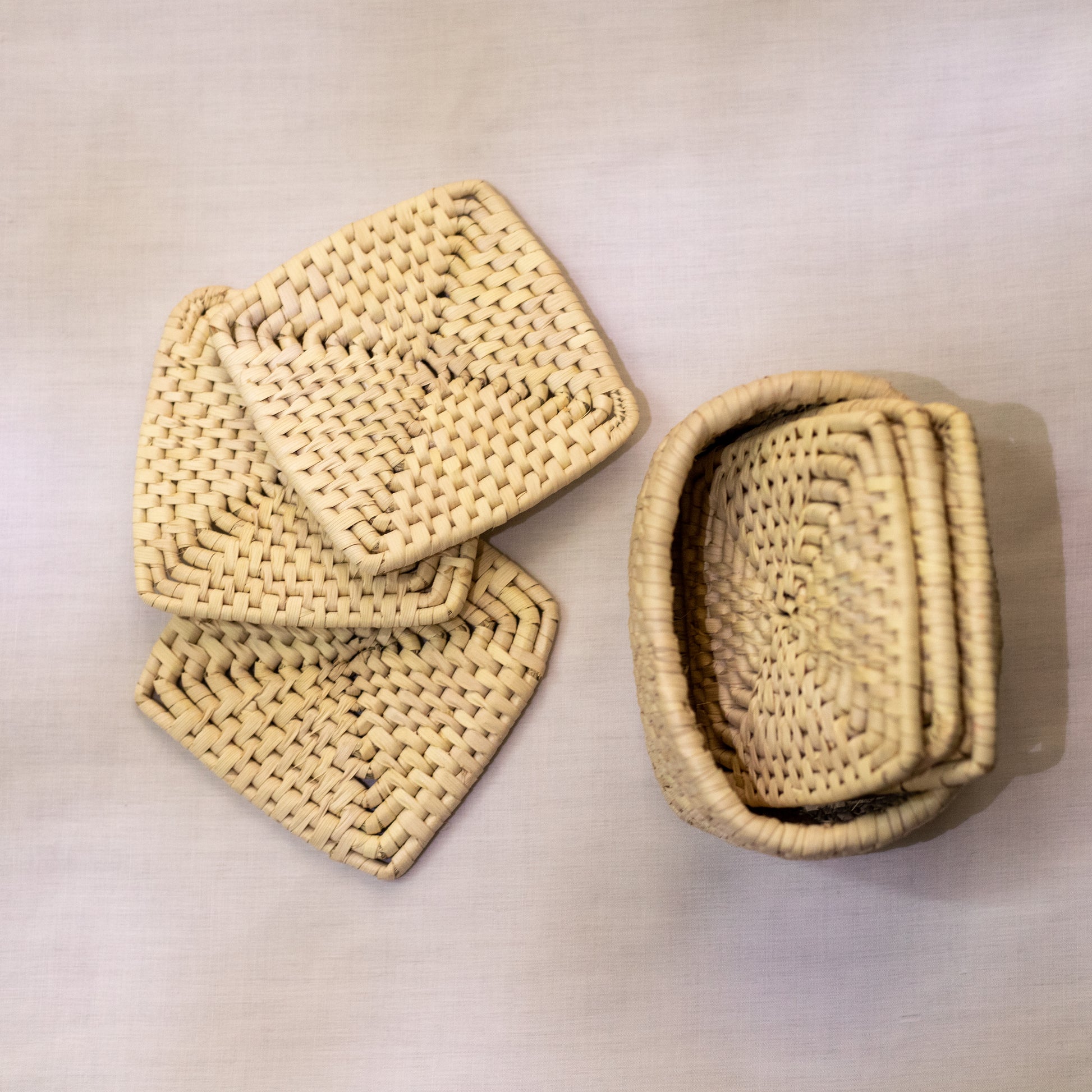 Woven by rural artisans using date palm leaves, this elegant coaster set brings earthy charm to your gatherings. Each piece rests in a matching handwoven box—both functional and beautiful. A quiet nod to traditional craft, designed for the mindful modern home Handmade by Rural female Artisans