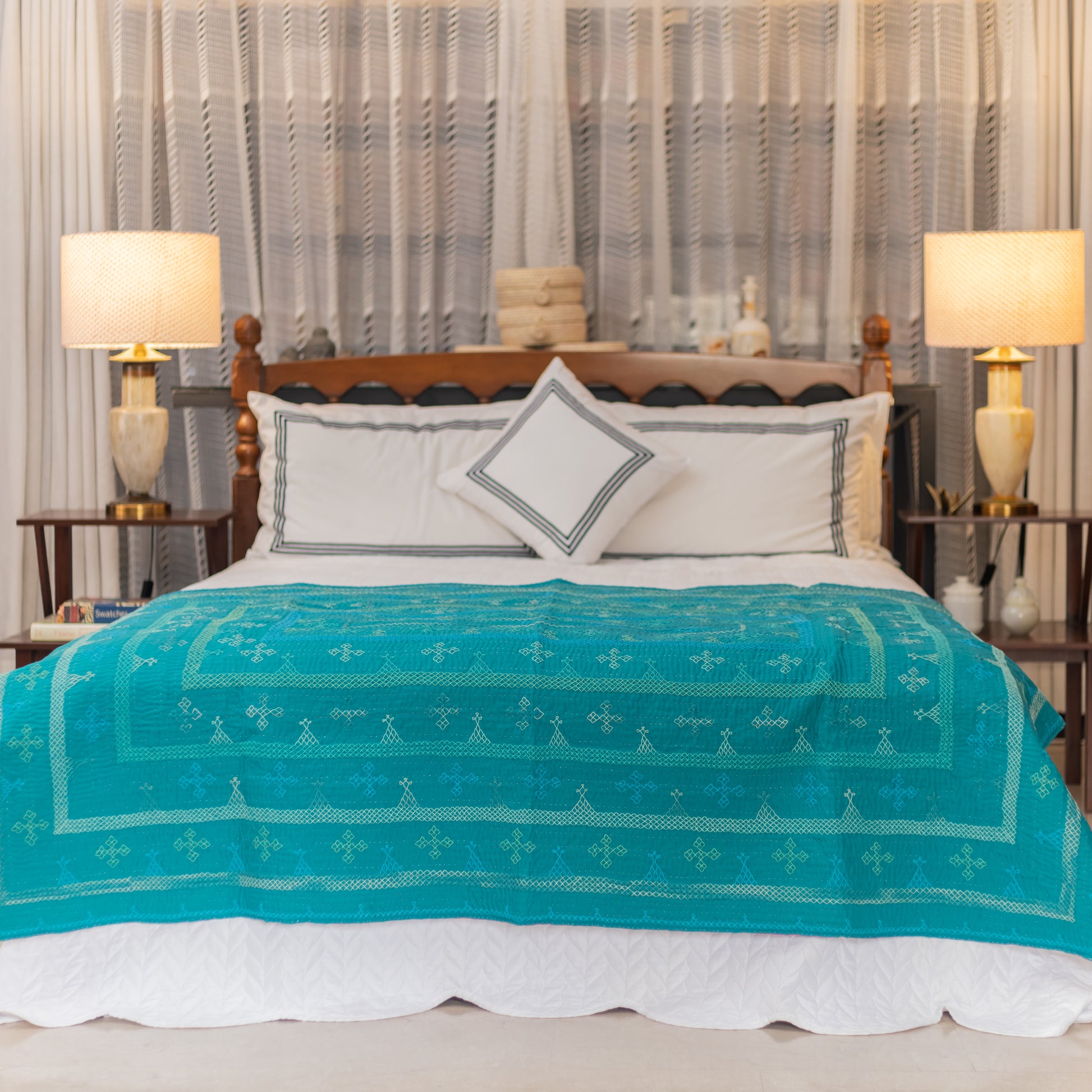 A vibrant reversible throw featuring intricate teal embroidery on one side and a striking pink base with traditional stitched motifs on the other. Perfect for adding color and charm to your space. Handmade by rural female artisans.