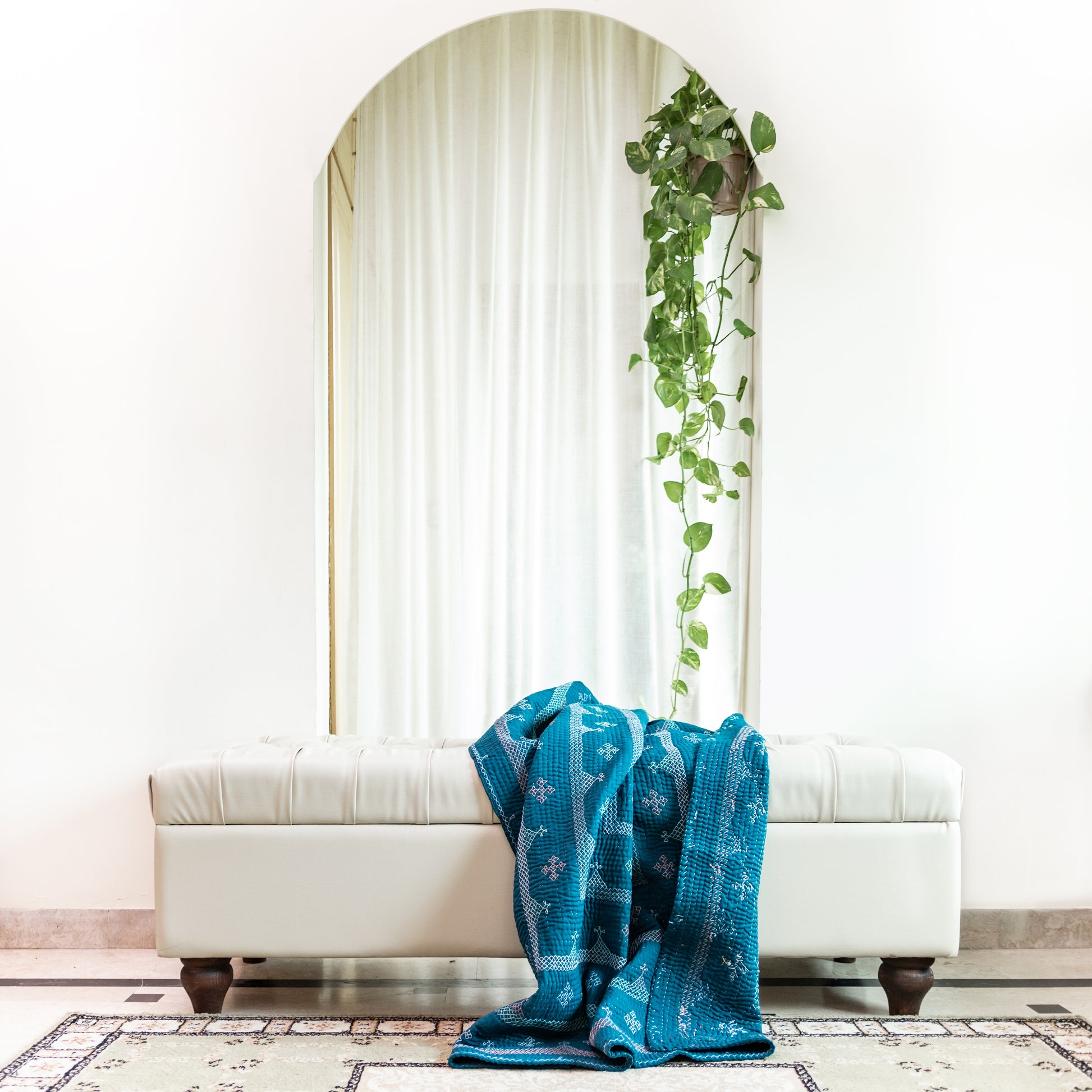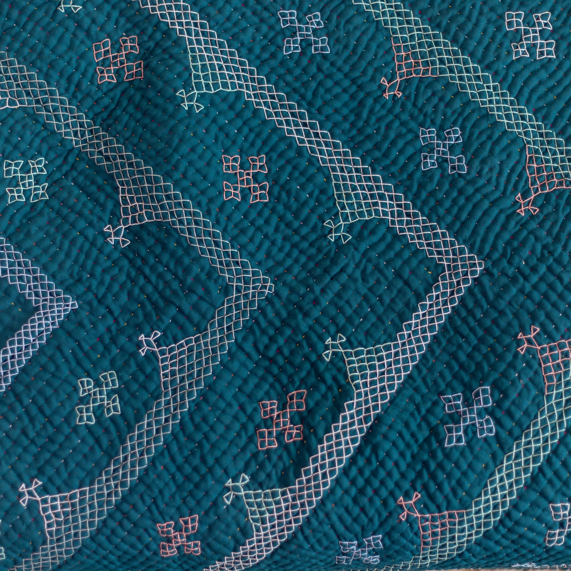 A vibrant hand-stitched rilli throw in rich teal, paired with a contrasting magenta back. Adorned with intricate traditional motifs, it adds both comfort and character to your space.
