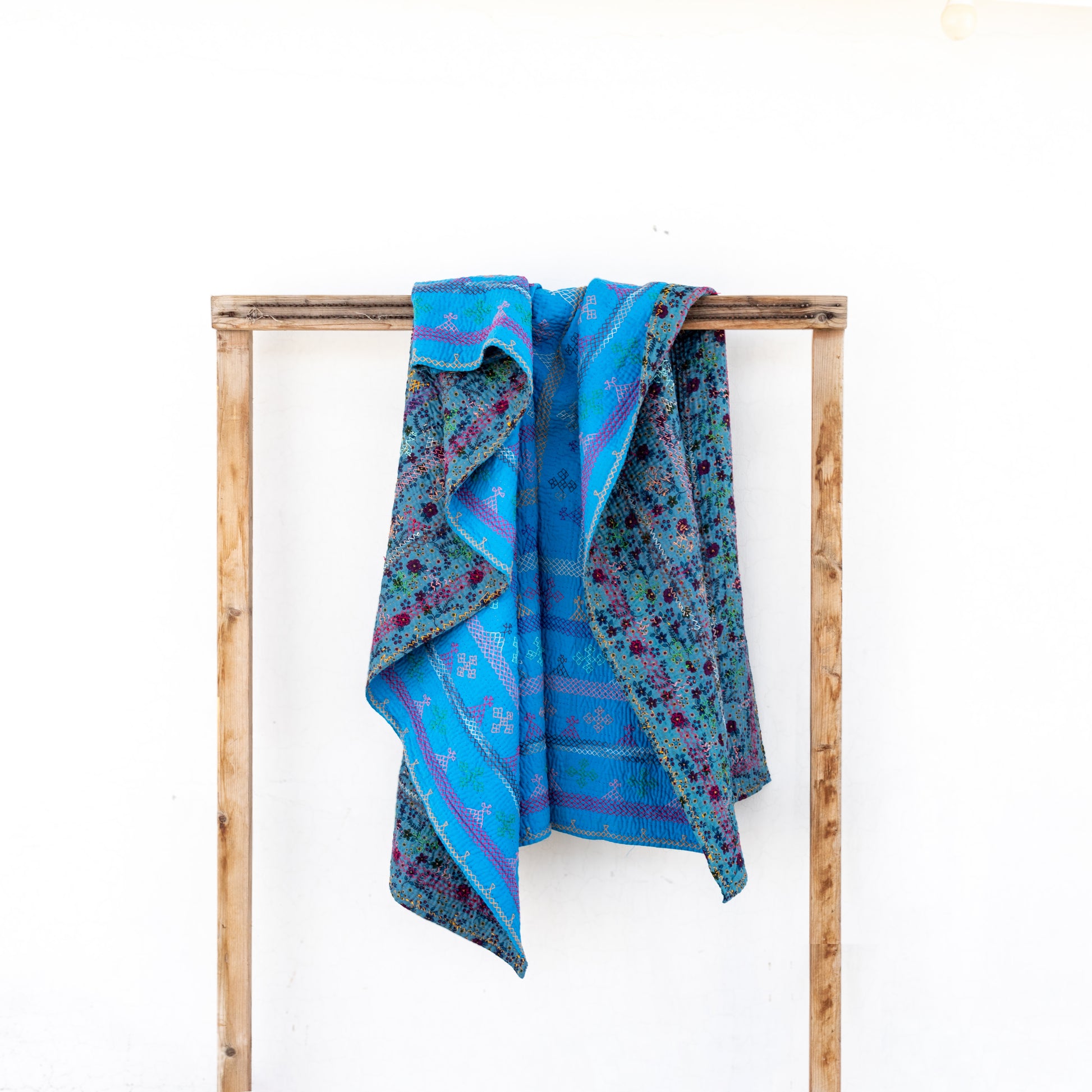 Vivid turquoise meets the quiet grace of olive florals in this reversible King Size. Hand-stitched by women artisans, it adds a soulful burst of color and craft to any space. Handmade by Rural female Artisans