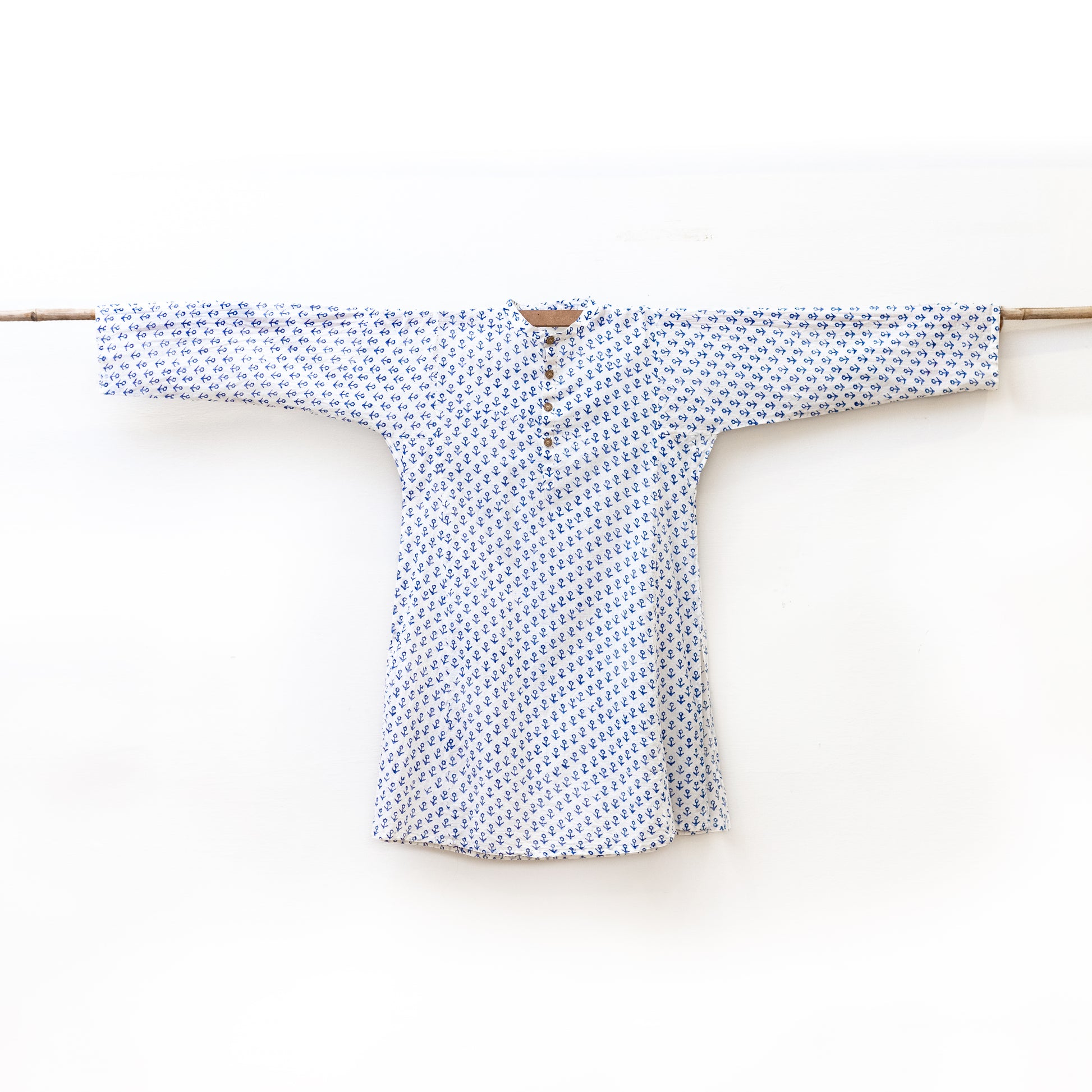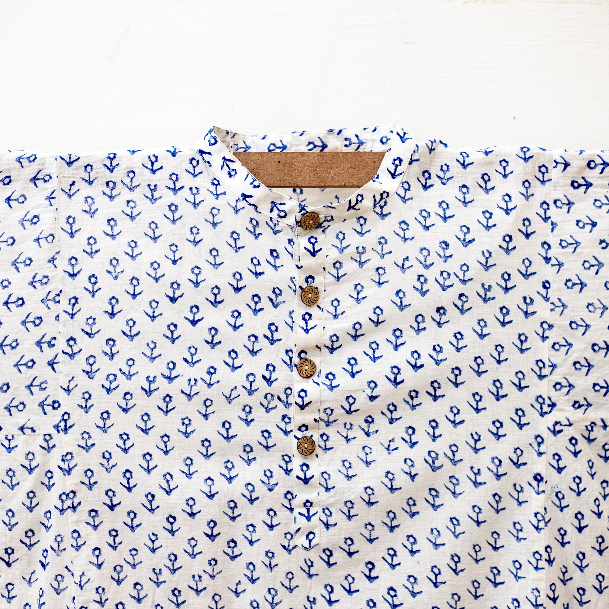 Pure cotton kurta patterned with serene blue prints. A refreshing design that pairs well for any occasion. Hand block-printed by rural artisans.