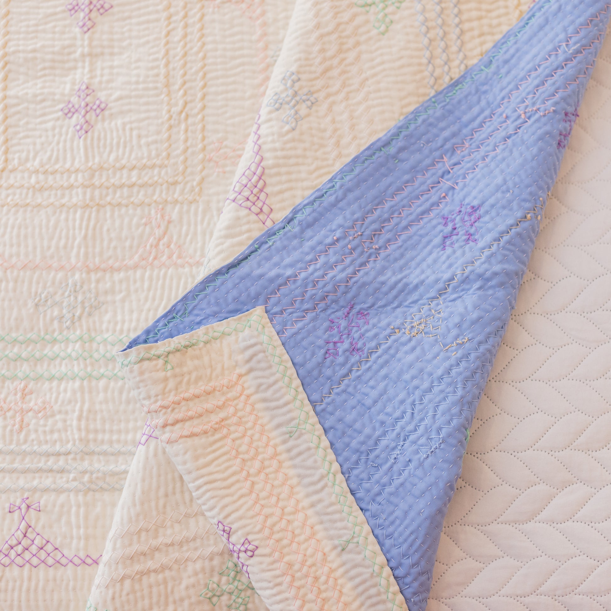 A soft white front delicately adorned with pastel hand-stitching gives this J Rilli a serene, airy charm. The reverse side in calming sky blue adds a gentle touch of cool elegance.