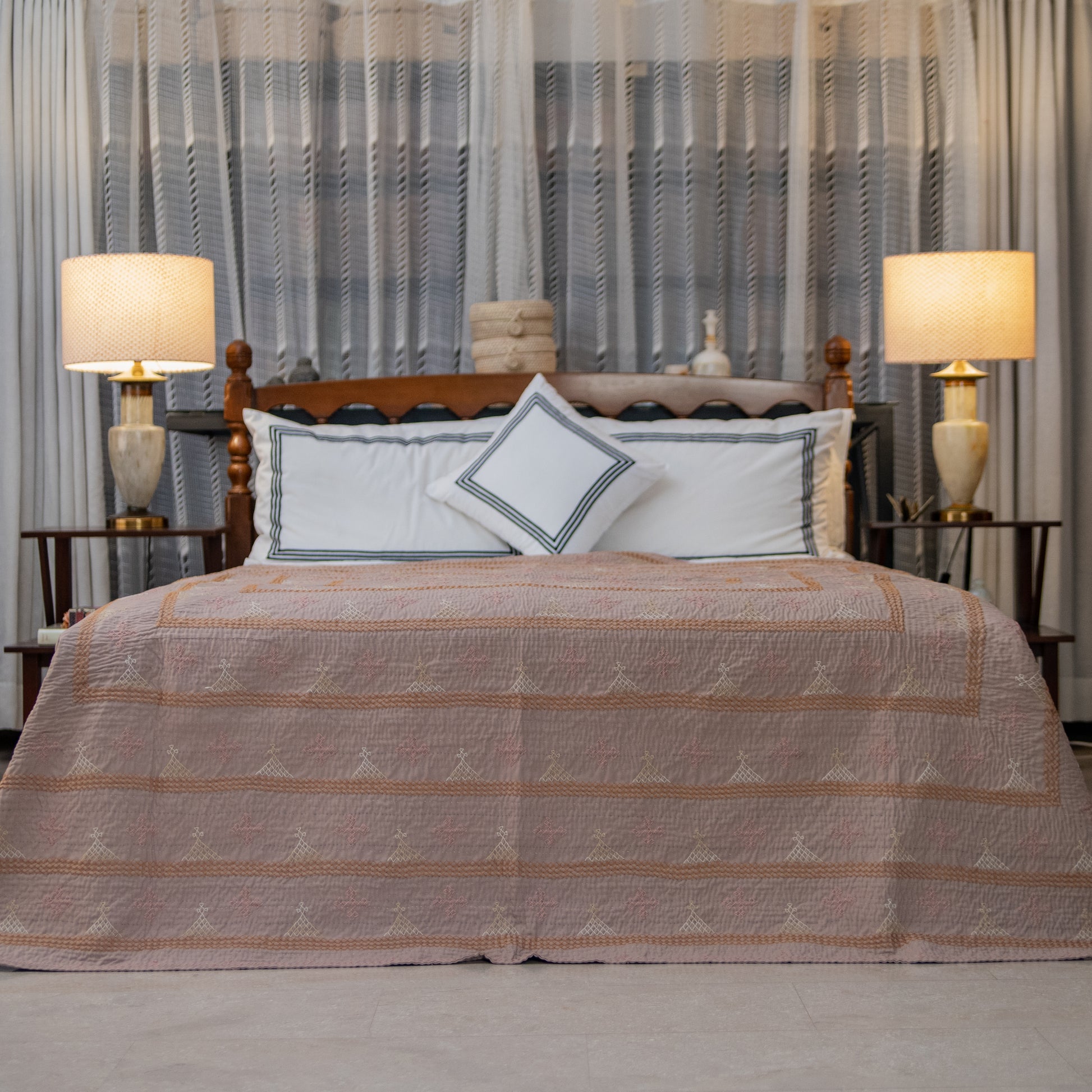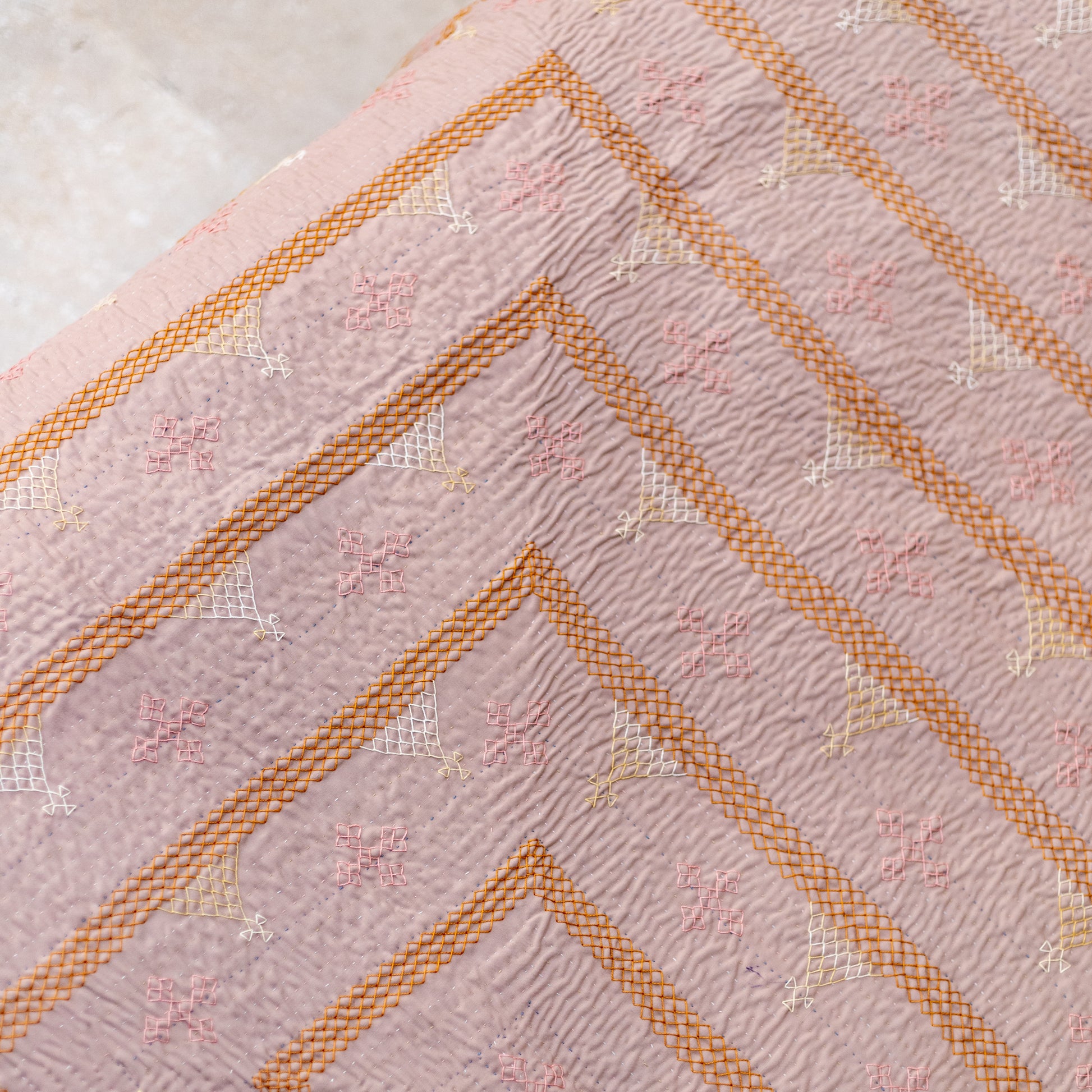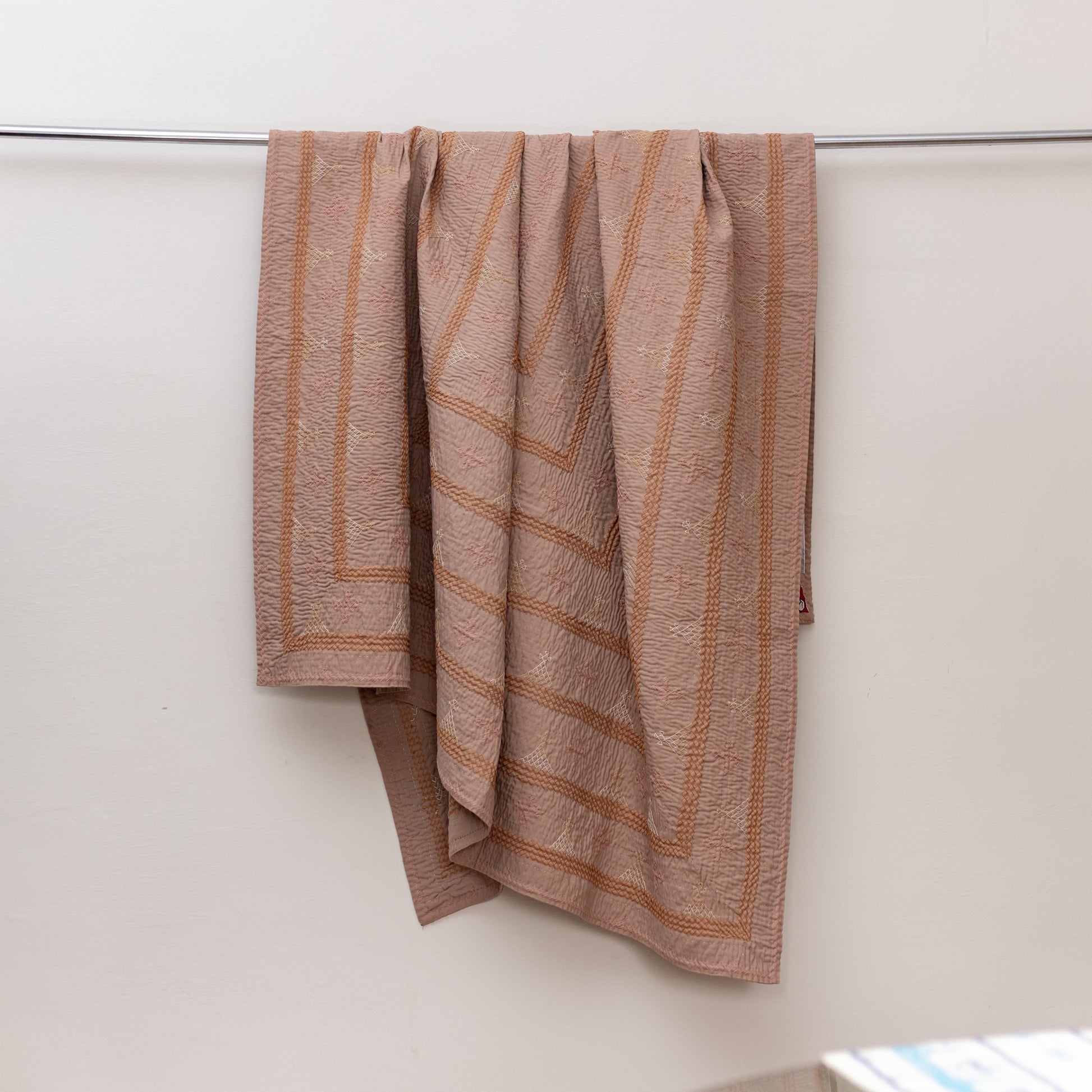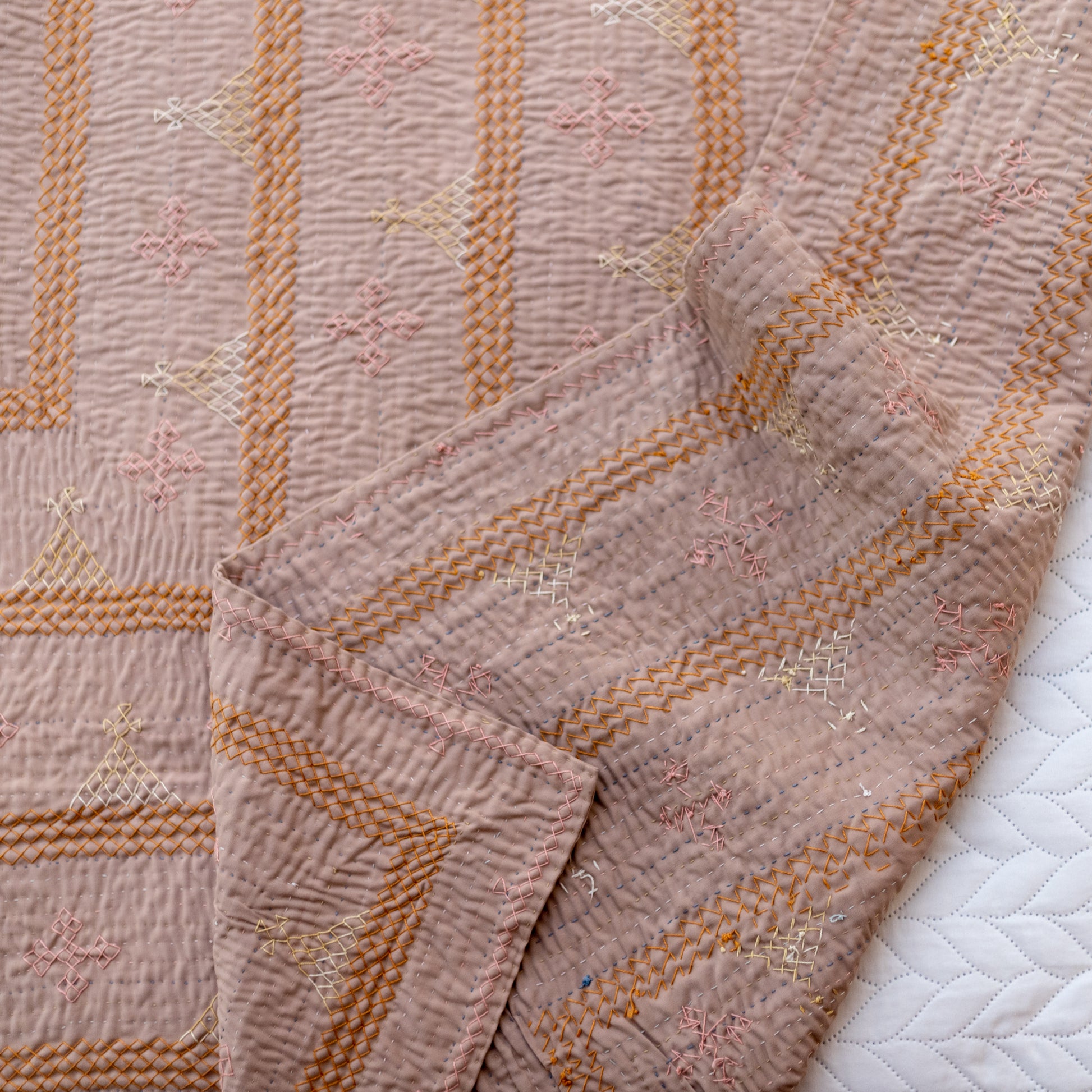 A soft mauve-brown rilli quilt accented with ochre and blush hand-stitching, creating a warm and earthy aesthetic. Perfect for layering or styling as a statement throw.